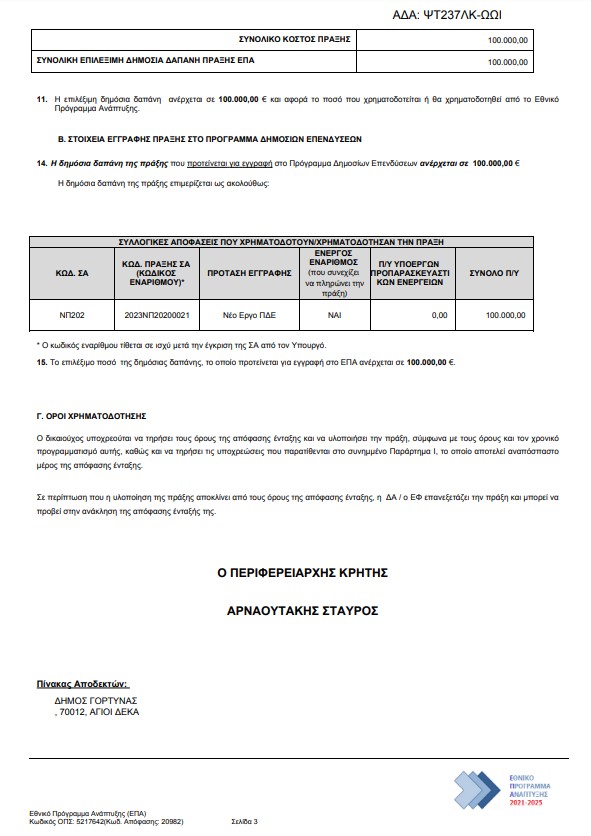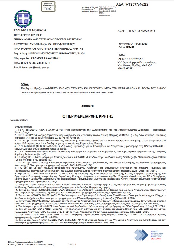 Ακόμα μια πολύ σημαντική χρηματοδότηση, ύψους 100.000 ευρώ, για την υλοποίηση ενός απολύτως αναγκαίου για την προστασία της δημόσιας ασφάλειας έργου, στην θέση Ψαλίδα, στην Γέργερη, εξασφάλισε η δημοτική αρχή, μέσω του Προγράμματος Περιφερειακής Ανάπτυξης «2021 – 2025» της Περιφέρειας Κρήτης. Η χρηματοδότηση πρόκειται να αξιοποιηθεί για την καθαίρεση παλαιάς γέφυρας, στα θεμέλια της οποίας παρατηρούνται υποσκαφές και για την δημιουργία νέας γέφυρας, στο ίδιο σημείο, ώστε να μετακινούνται με ασφάλεια οι διερχόμενοι οδηγοί.