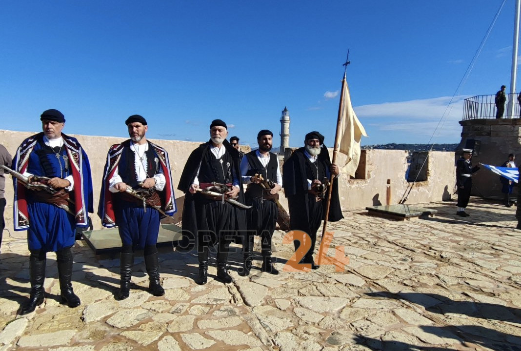 Στο φρούριο του Φιρκά, εκεί όπου κάποτε φυλακίζονταν οι αγωνιστές, βρέθηκαν πλάι-πλάι η εμπειρία, η πολιτική διορατικότητα και η μακραίωνη κρητική γενναιότητα. Ο Βασιλιάς Κωνσταντίνος και ο Πρωθυπουργός της Ελλάδας Ελευθέριος Βενιζέλος, στέκονταν δίπλα σε δύο σεβάσμιες μορφές της κρητικής λεβεντιάς, τον Χατζημιχάλη Γιάνναρη και τον Αναγνώστη Μάντακα. Οι δύο γέροντες, κουβαλώντας το βάρος δεκαετιών αγώνα, έγιναν οι σιωπηλοί εκπρόσωποι όλων όσοι είχαν δώσει τη ζωή τους για να φτάσει η μέρα εκείνη.