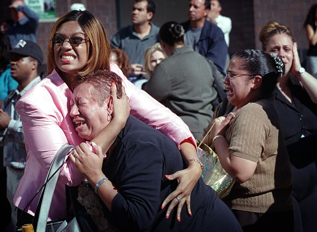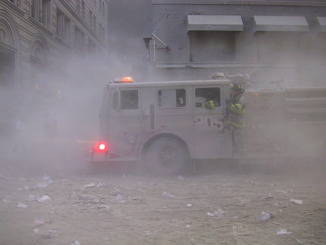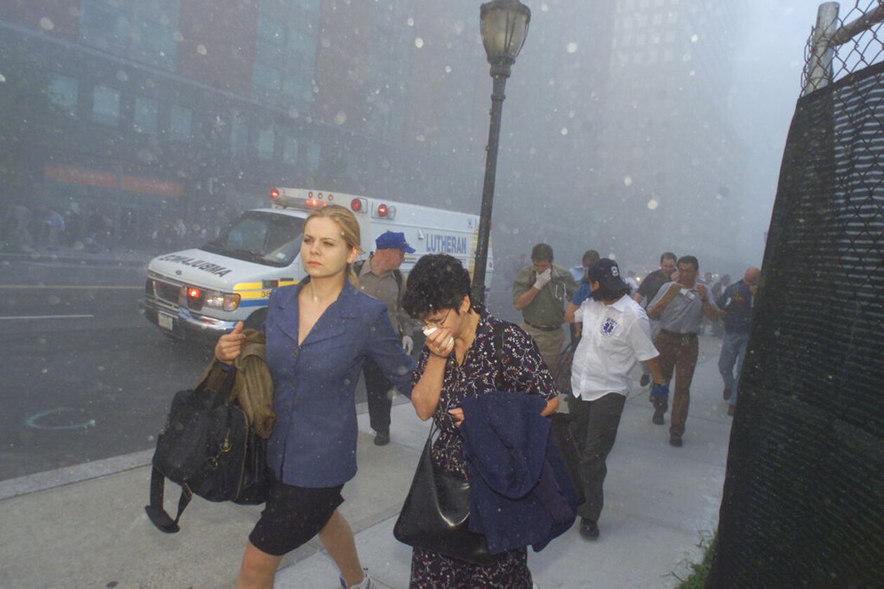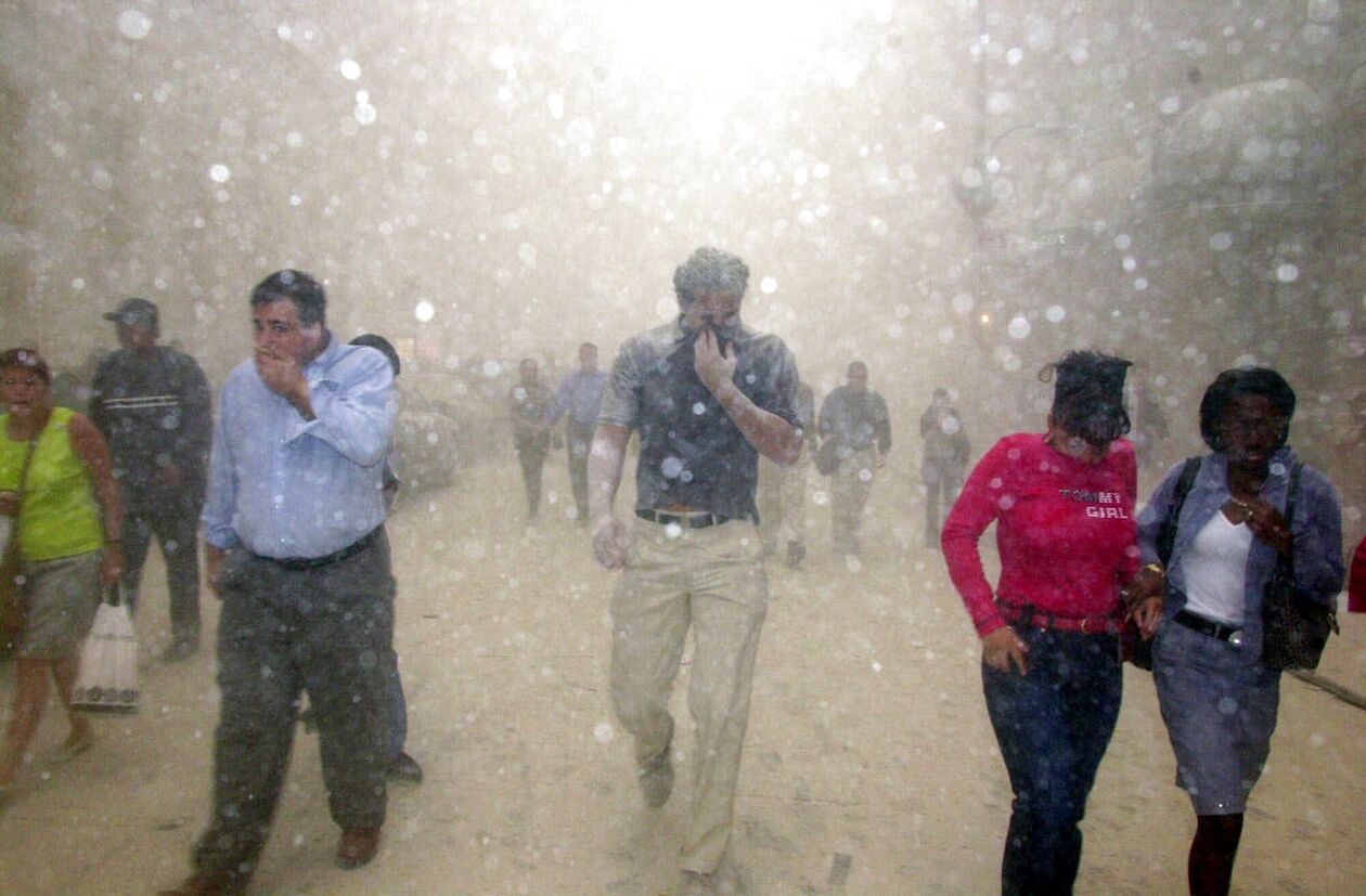 Μέσα στα ουρλιαχτά από τις σειρήνες, άνθρωποι τρέχουν για να γλιτώσουν από το τεράστιο κύμα ερειπίων και καπνού που καλύπτει τη συνοικία. Ο δήμαρχος Ρούντι Τζουλιάνι ζητεί από τους κατοίκους «να παραμείνουν ήρεμοι και, αν είναι δυνατόν, να φύγουν από την κάτω πλευρά του Μανχάταν».
