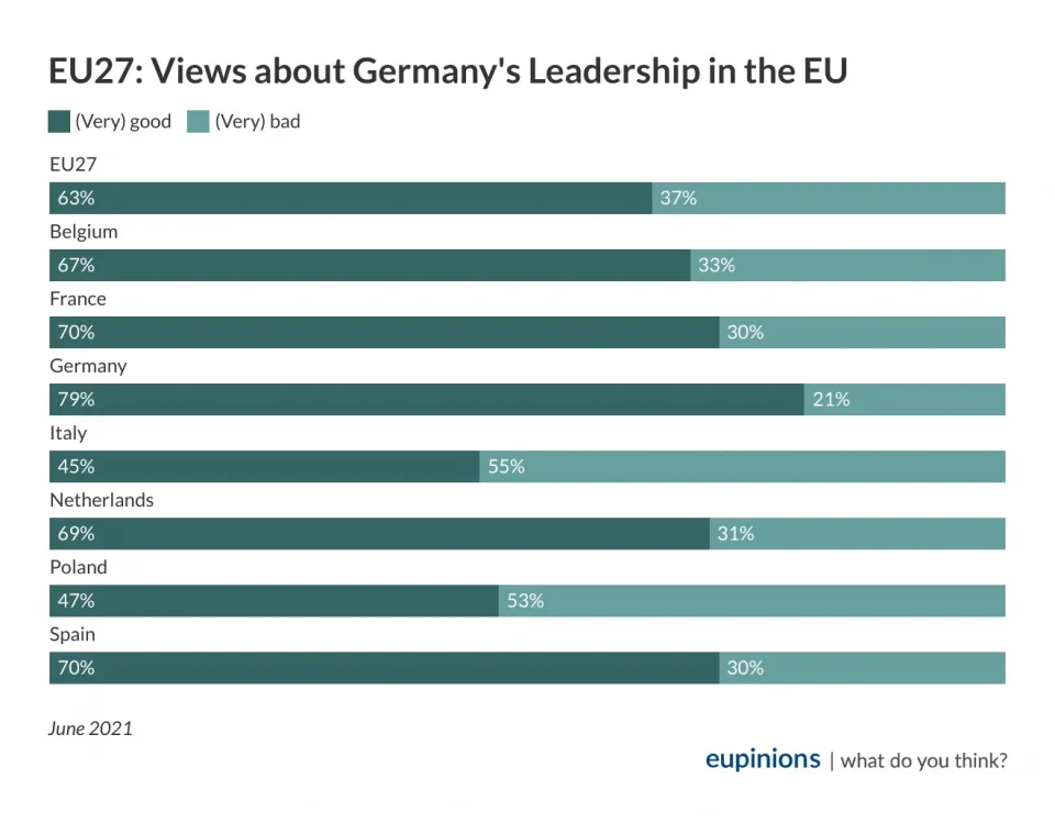Είναι ενδεικτικό ότι το 63% των Ευρωπαίων ερωτηθέντων θεωρεί τον ηγετικό ρόλο της Γερμανίας στην Ευρωπαϊκή Ένωση γενικά θετικό, ενώ το 37% των Ευρωπαίων ερωτηθέντων τον θεωρεί αρνητικό. Ωστόσο, υπάρχουν σημαντικές διαφορές μεταξύ των κρατών μελών. Η πλειοψηφία των Ιταλών και Πολωνών ερωτηθέντων θεωρεί αρνητικό τον ηγετικό ρόλο της Γερμανίας στην Ευρωπαϊκή Ένωση. Το 55% και το 53% των Ιταλών και Πολωνών ερωτηθέντων δηλώνουν ότι θεωρούν τον ηγετικό ρόλο της Γερμανίας στην Ευρωπαϊκή Ένωση κακό ή πολύ κακό, ενώ το 45% και το 47% θεωρούν ότι είναι καλό ή πολύ καλό.
