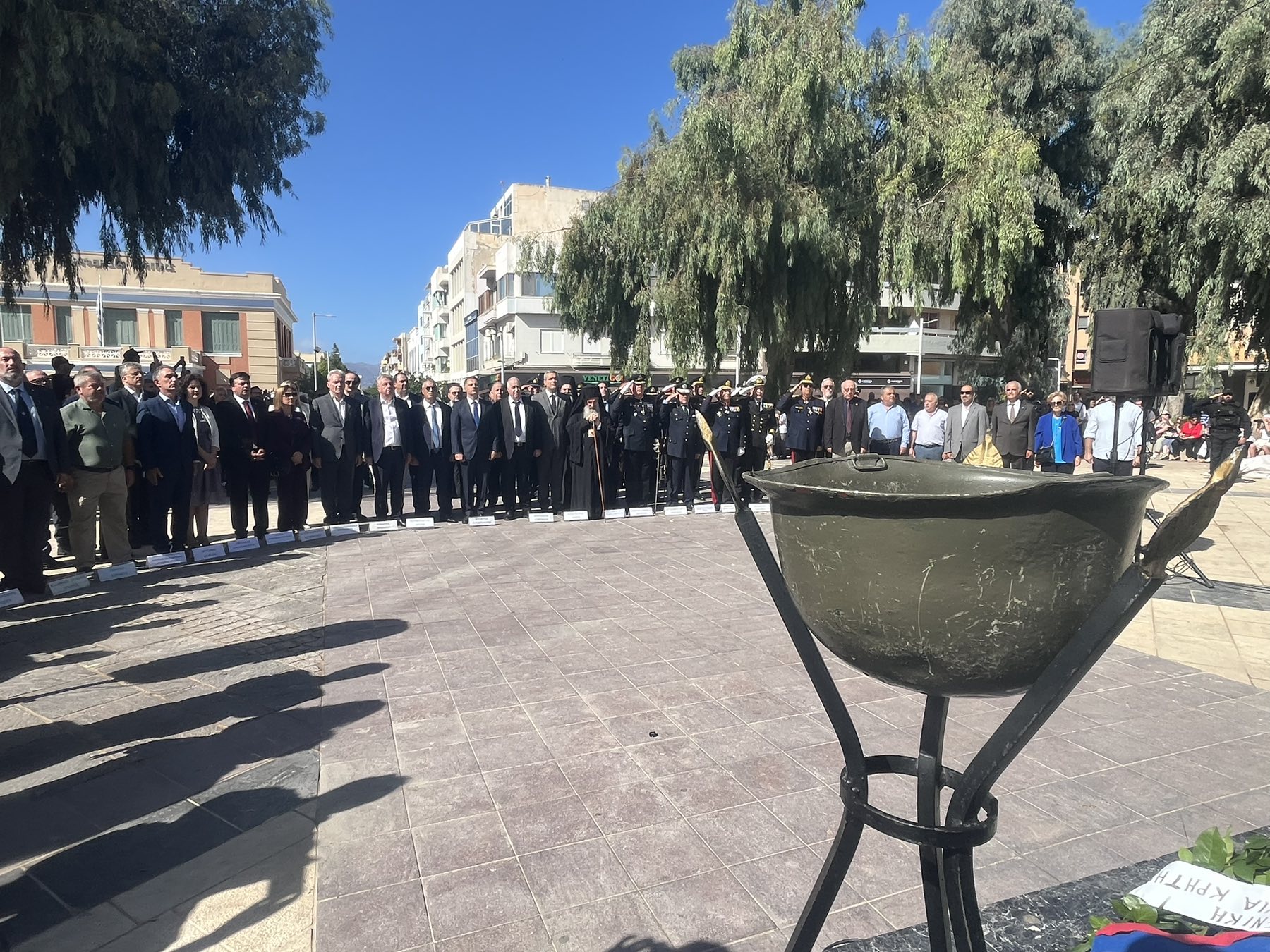 Ακολούθησε τελετή στο άγαλμα του Άγνωστου Στρατιώτη όπου τελέστηκε επιμνημόσυνη δέηση από τον Σεβασμιότατο Αρχιεπίσκοπο Κρήτης κ. Ευγένιο και κατάθεση στεφάνων από τον εκπρόσωπο του Προέδρου της Βουλής Μάξιμο Σενετάκη, τον εκπρόσωπο της Κυβέρνησης Γενικό Γραμματέα Πρωτοβάθμιας, Δευτεροβάθμιας Εκπαίδευσης και Ειδικής Αγωγής Ιωάννη Παπαδομαρκάκη, τον Βουλευτή ΣΥΡΙΖΑ Ηρακλείου Χάρη Μαμουλάκη, τον ανεξάρτητο βουλευτή Ηρακλείου Μιχάλη Γαυγιωτάκη, τον Περιφερειάρχη Κρήτης Σταύρο Αρναουτάκη, τον Δήμαρχο Ηρακλείου Αλέξη Καλοκαιρινό, την Γραμματέα της Αποκεντρωμένης Διοίκησης Κρήτης Μαρία Κοζυράκη, τον Ανώτερο Διοικητή Φρουράς Ηρακλείου ως εκπρόσωπος των Ενόπλων Δυνάμεων και των Σωμάτων Ασφαλείας, Εκπαιδευτικών Ιδρυμάτων, κομμάτων, Αποστράτων Σωμάτων Ασφαλείας, εκπροσώπους φορέων, αντιστασιακών οργανώσεων και θυμάτων πολέμου. Αυτή την ώρα είναι σε εξέλιξη η μαθητική και στρατιωτική παρέλαση στη Λ. Δημοκρατίας.