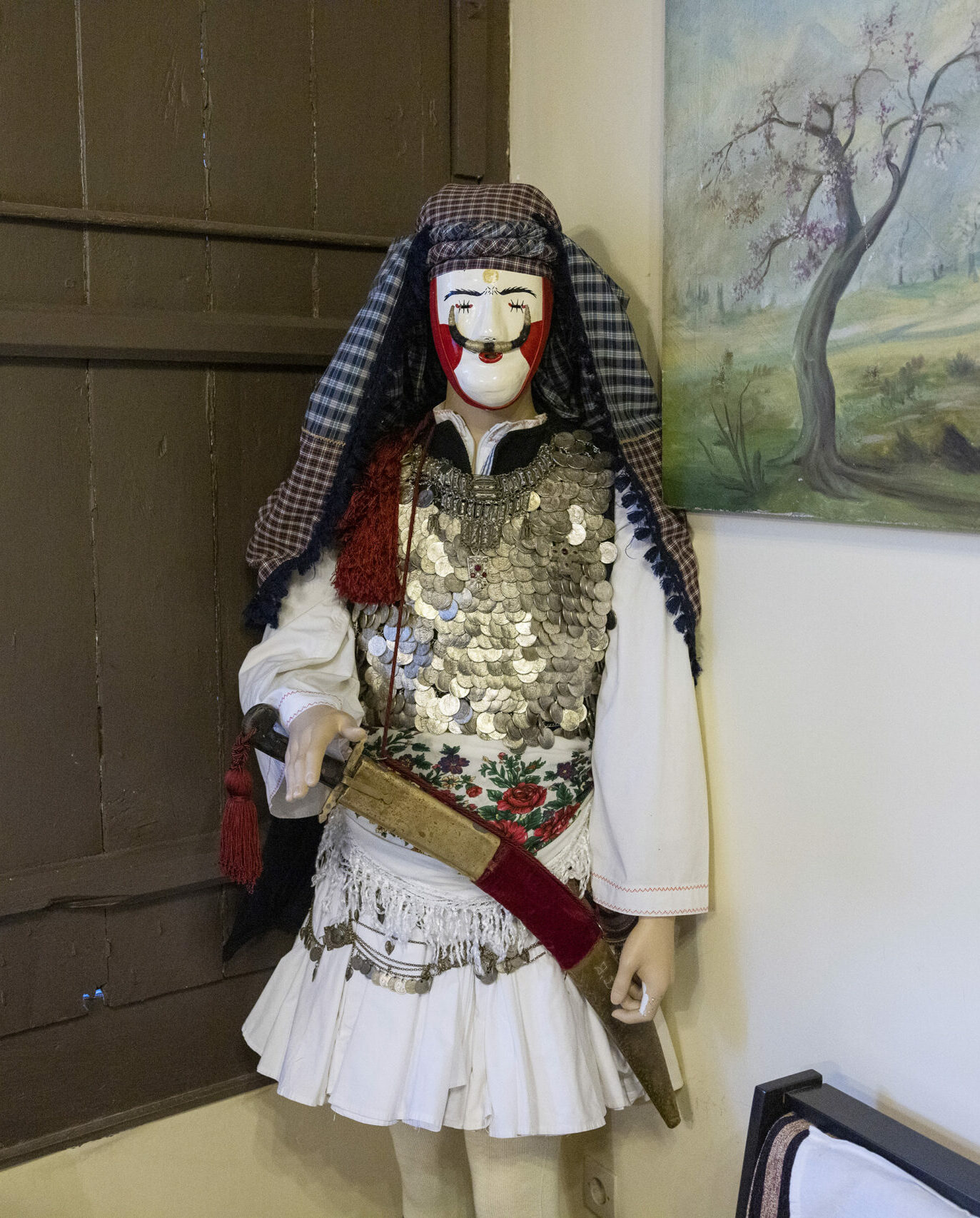 O γέρος φοράει μαύρη κάπα και άσπρη βράκα, δηλαδή τη χειμερινή παραδοσιακή φορεσιά των βοσκών του νησιού και μάσκα στο πρόσωπο. Στην πλάτη του έχει μια ψεύτικη καμπούρα φτιαγμένη από κουρέλια. Όμως, το βασικό «αξεσουάρ» του είναι τα κουδούνια που είναι περασμένα στη μέση του. Δεν είναι εύκολο να τα μεταφέρει κανείς, μπορεί να φθάσουν σε βάρος δεκάδες κιλά. Είναι ακόμα δυσκολότερο να πετύχει κανείς τον δυνατό και ταυτόχρονα μελωδικό ήχο που απαιτεί το έθιμο. Όμως οι Σκυριανοί, με τις στολές και την «εκπαίδευση» στα κουδούνια να μεταφέρονται ως κειμήλιο από γενιά σε γενιά, τα καταφέρνουνν.