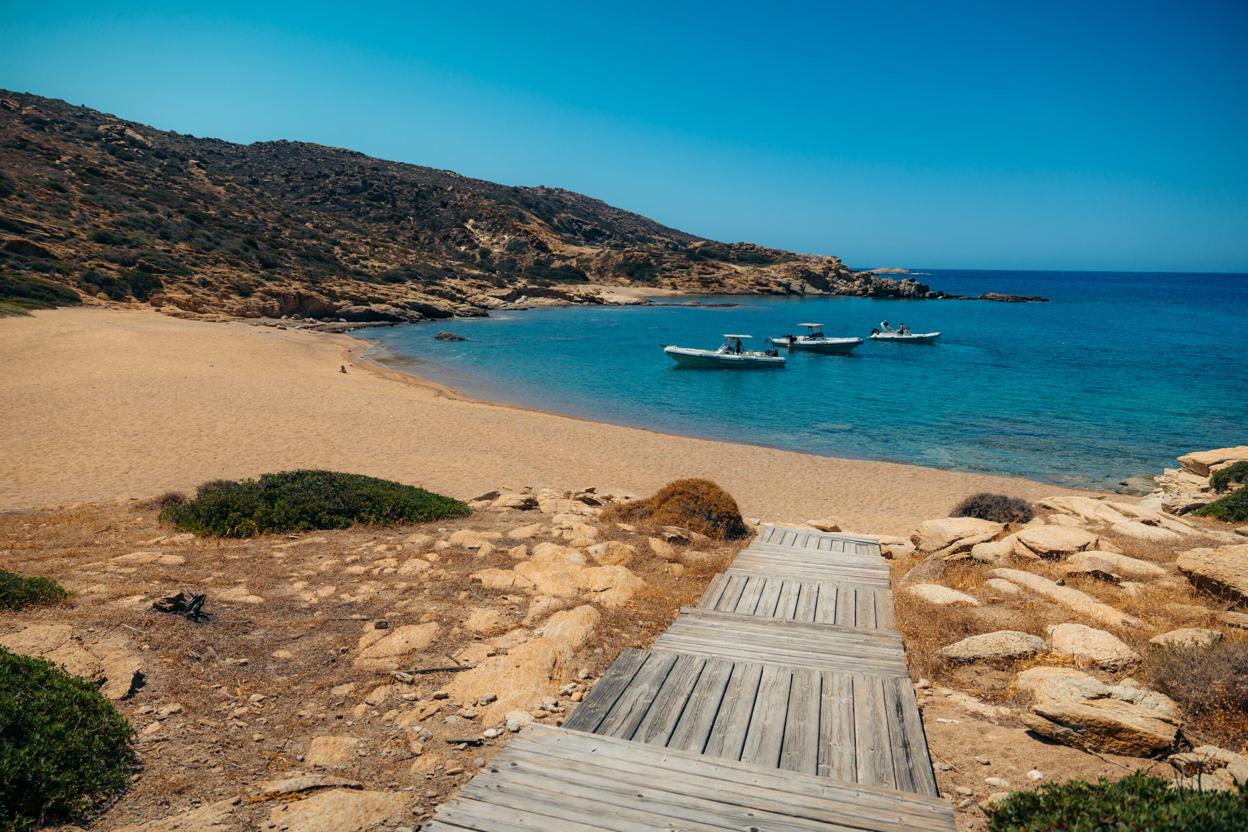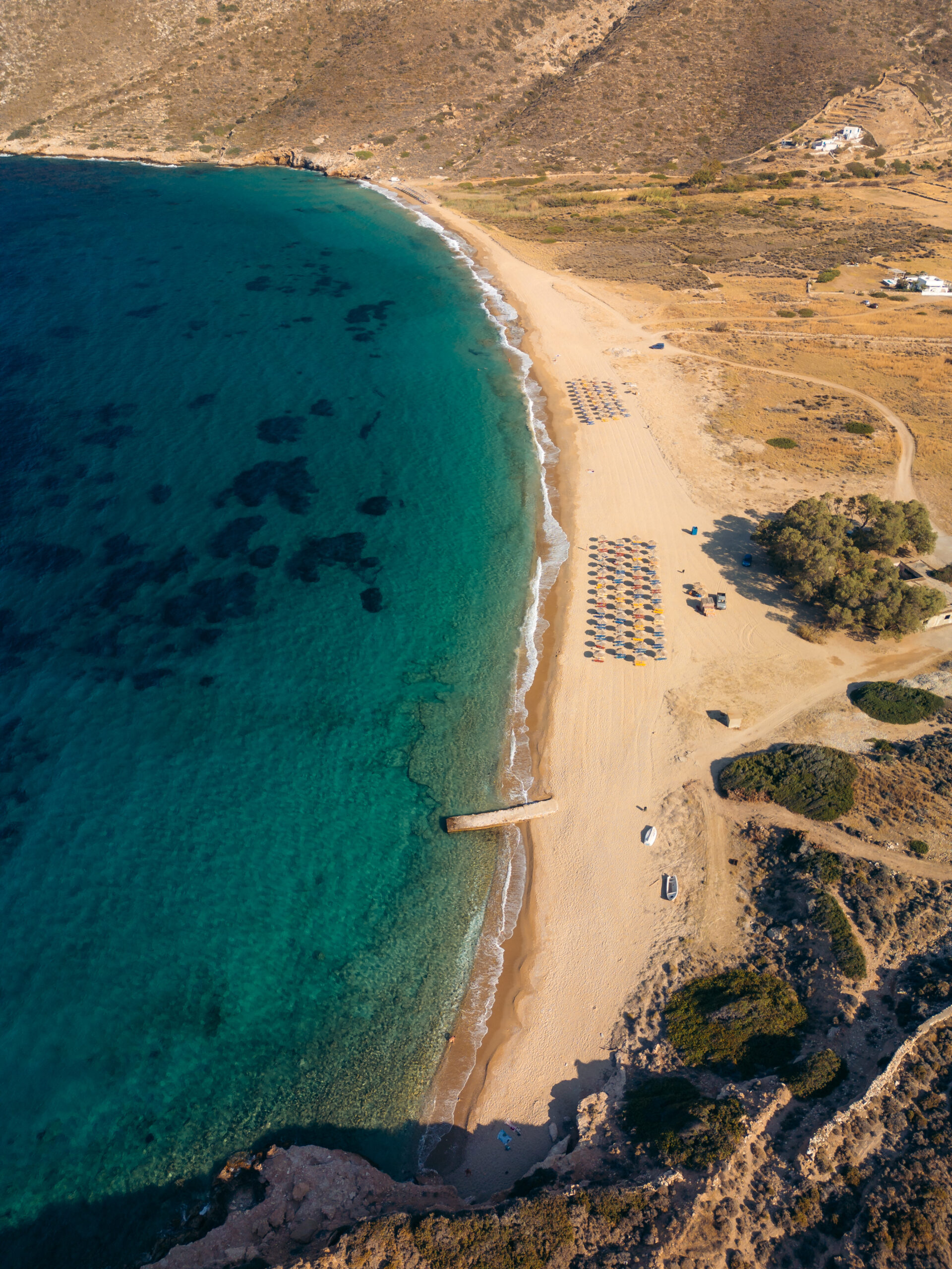 Ένας κόλπος με χρυσαφένια αμμουδιά και βαθυγάλαζα νερά, 10 χιλιόμετρα από τη Χώρα. Τα νερά είναι ρηχά, οπότε η παραλία είναι κατάλληλη και για οικογένειες, υπάρχει ένα οργανωμένο κομμάτι και τα αρμυρίκια προσφέρουν τη σκιά τους.