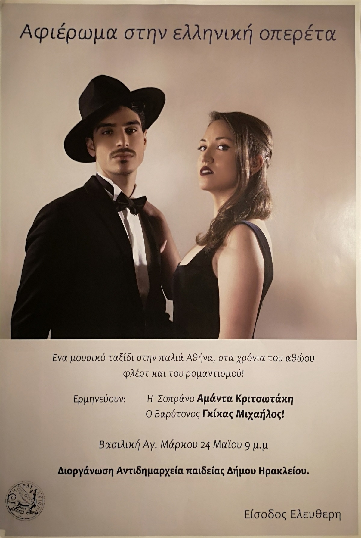 Συναυλία με τίτλο «Αφιέρωμα στην ελληνική οπερέτα», ένα μουσικό ταξίδι στην παλιά Αθήνα, στα χρόνια του αθώου φλέρτ και του ρομαντισμού, θα πραγματοποιηθεί την Παρασκευή 24 Μαΐου και ώρα 21:00 στη Βασιλική Αγίου Μάρκου.