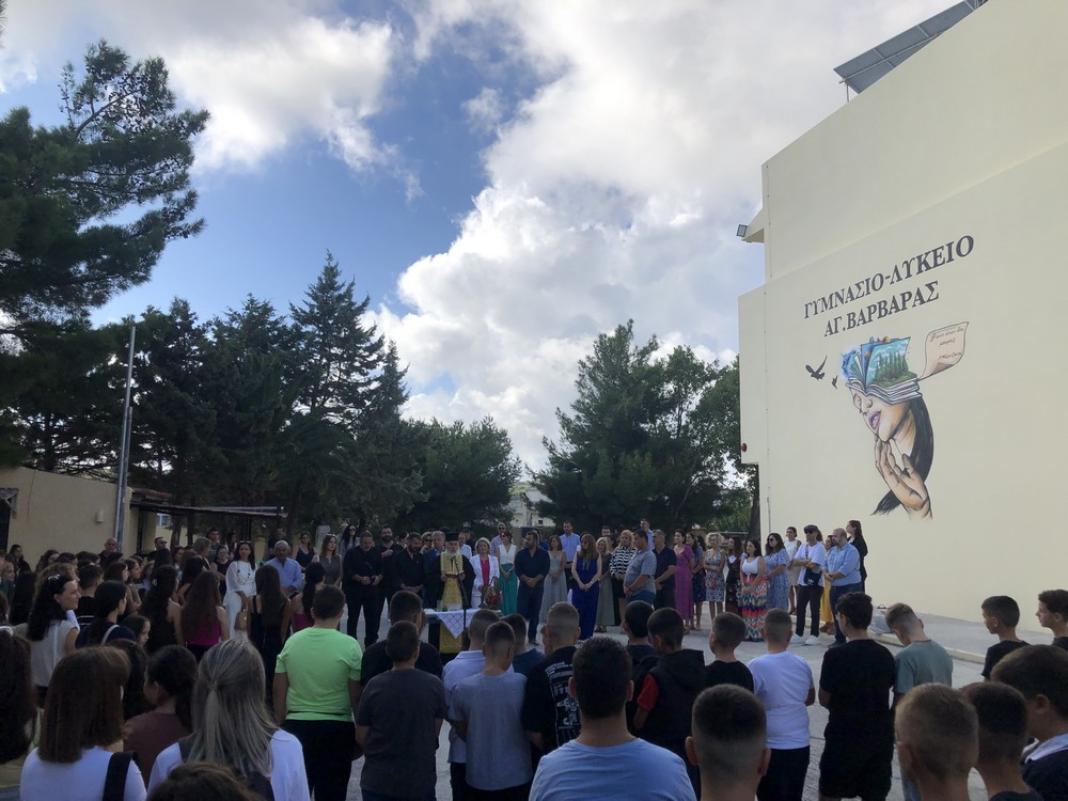 Ο Δήμαρχος, Μιχάλης Κοκολάκης, παραβρέθηκε στον αγιασμό του Δημοτικού Σχολείου Αγίας Βαρβάρας και του Γυμνασίου – Λυκείου Αγίας Βαρβάρας, που μετά την ολοκλήρωση των εργασιών στατικής ενίσχυσης και ενεργειακής αναβάθμισης των κτιριακών εγκαταστάσεων, υποδέχθηκε ξανά μαθητές και εκπαιδευτικούς. «Παραδίδουμε ένα κτίριο στο οποίο έγιναν πολλές και σημαντικές παρεμβάσεις, με γνώμονα την ασφάλεια παιδιών και εκπαιδευτικών. Ευχαριστούμε θερμά την Περιφέρεια Κρήτης και τον Περιφερειάρχη, κ. Σταύρο Αρναουτάκη, τα παιδιά, τους καθηγητές, τους εργαζομένους στην καθαριότητα των σχολείων για την υπομονή και την κατανοήσή τους, ευχαριστούμε όλους όσοι εργάστηκαν και συνέβαλαν, ώστε να φθάσουμε σε αυτό το αποτέλεσμα. Καλή σχολική χρονιά, με υγεία και ασφάλεια και ευχόμαστε αυτή η χρονιά να φέρει τα παιδιά ένα βήμα πιο κοντά στους στόχους που έχουν θέσει» τόνισε ο Δήμαρχος, Μιχάλης Κοκολάκης, στον σύντομο χαιρετισμό του.