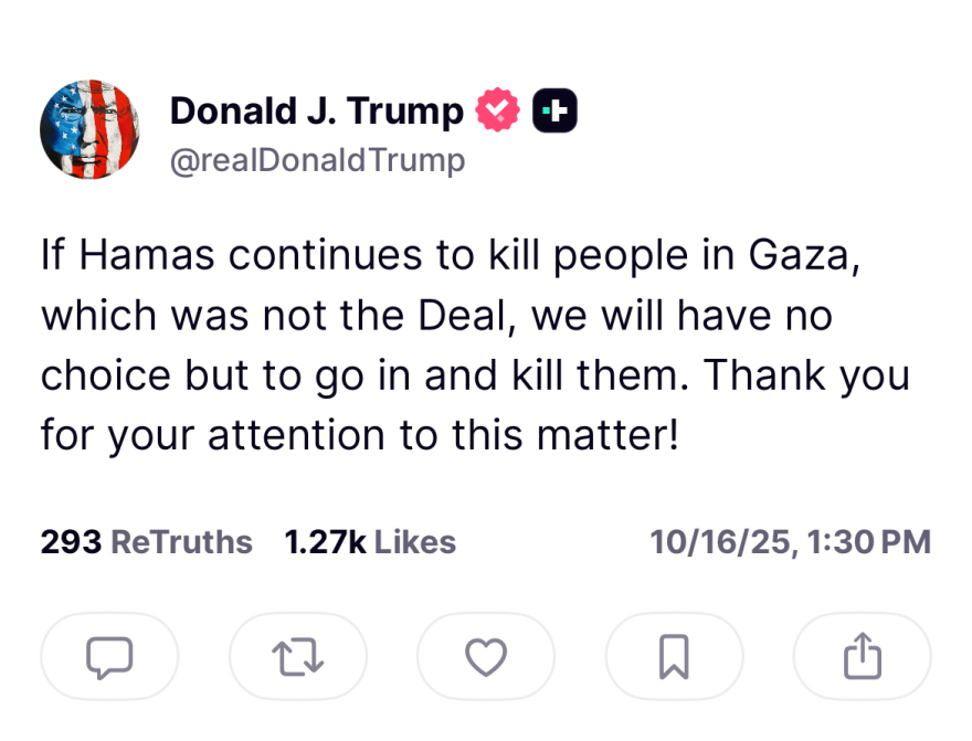 «Αν η Χαμάς συνεχίζει να σκοτώνει ανθρώπους στη Γάζα, κάτι που δεν ήταν στη Συμφωνία, δεν θα έχουμε άλλη επιλογή από το να μπούμε και να τους σκοτώσουμε. Σας ευχαριστώ για την προσοχή σας σε αυτό το θέμα!», γράφει.