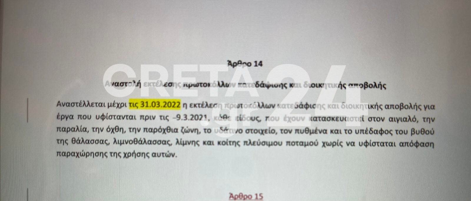 Έτσι πλέον, με την απόφαση αυτή, αναστέλλεται μέχρι τις 31 Μαρτίου 2022, η εκτέλεση πρωτοκόλλων κατεδάφισης και διοικητικής αποβολής για έργα που υφίστανται πριν τις 9 Μαρτίου του 2021, κάθε είδους που έχουν κατασκευαστεί στον αιγιαλό, την παραλία, την όχθη την παρόχθια ζώνη, το υδάτινο στοιχείο, τον πυθμένα και το υπέδαφος του βυθού της θάλασσας, λιμνοθάλασσας, λίμνης και κοίτης πλεύσιμου ποταμού χωρίς να υφίσταται απόφαση παραχώρησης της χρήσης αυτών.