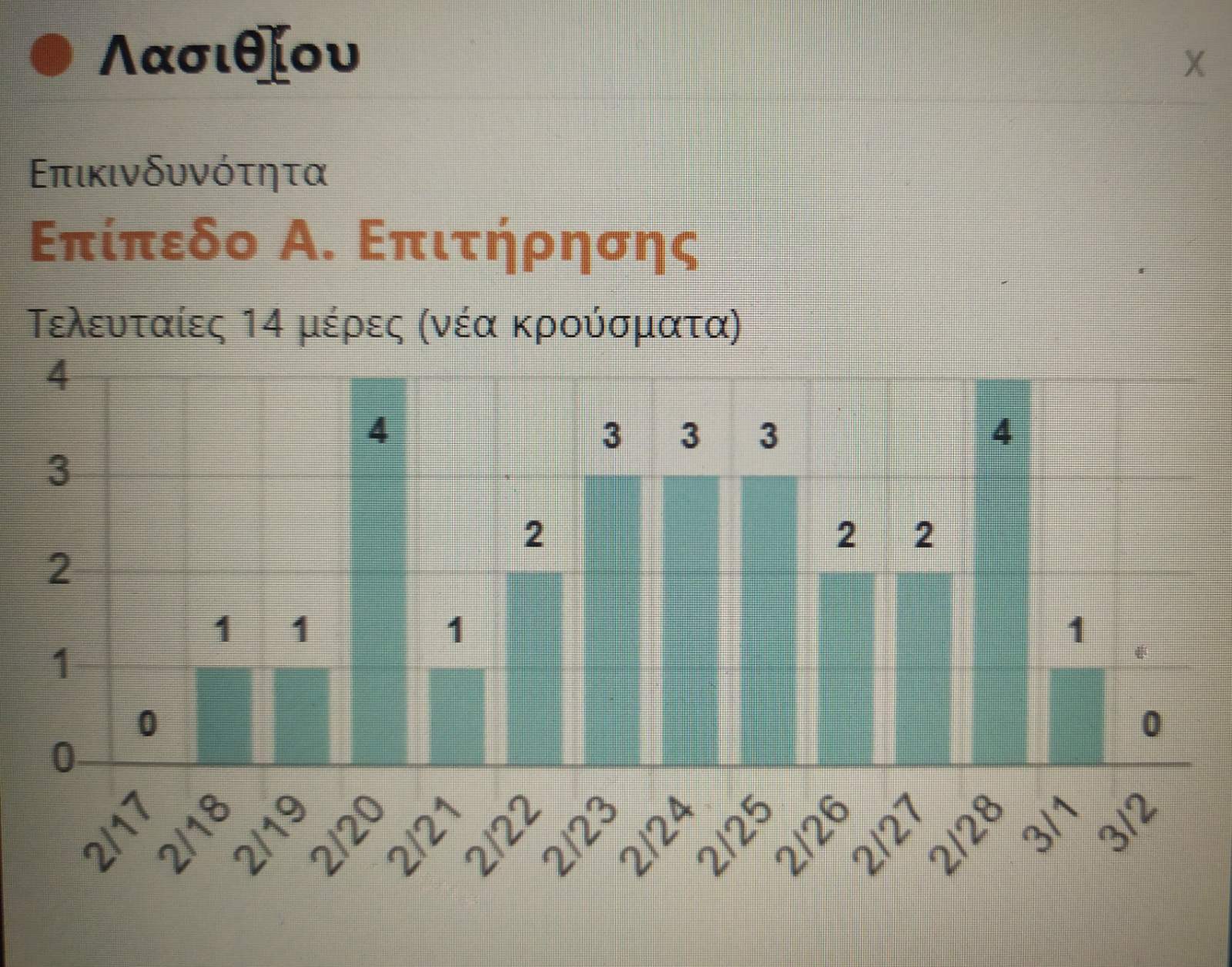 Τέλος στην Περιφερειακή Ενότητα Λασιθίου ο αριθμός των κρουσμάτων των τελευταίων 14 ημερών είναι μόλις 25 ενώ από την αρχή της πανδημίας έχουν διαπιστωθεί συνολικά 357 μολύνσεις με κορωνοϊό.