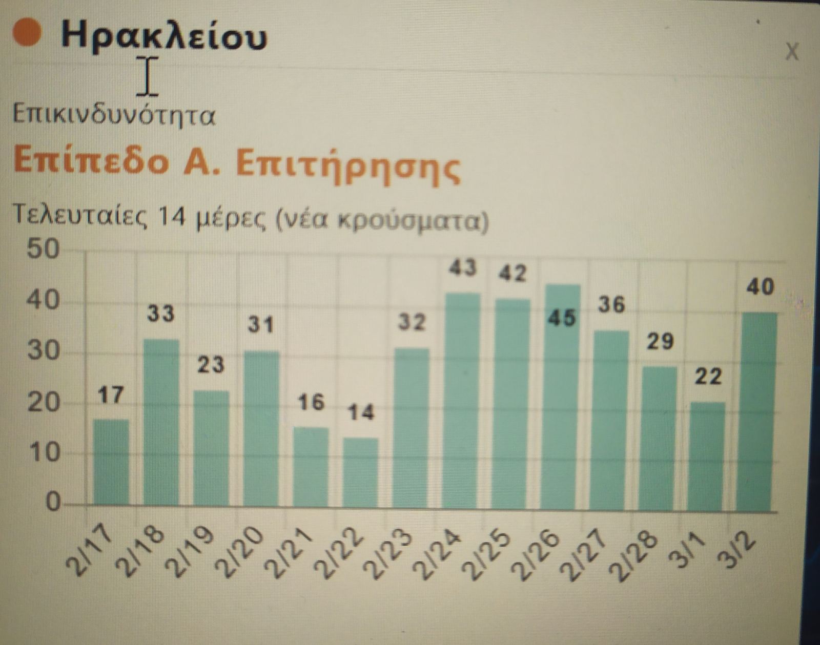 Συγκεκριμένα η Περιφερειακή Ενότητα Ηρακλείου έχει αυτή τη στιγμή 419 ενεργά κρούσματα, δηλαδή κρούσματα που έχουν διαπιστωθεί τις τελευταίες 14 ημέρες με μία αύξηση σε σχέση με το προηγούμενο δεκαπενθήμερο 105% ενώ ο συνολικός αριθμός κρουσμάτων από την αρχή της πανδημίας είναι 1992.