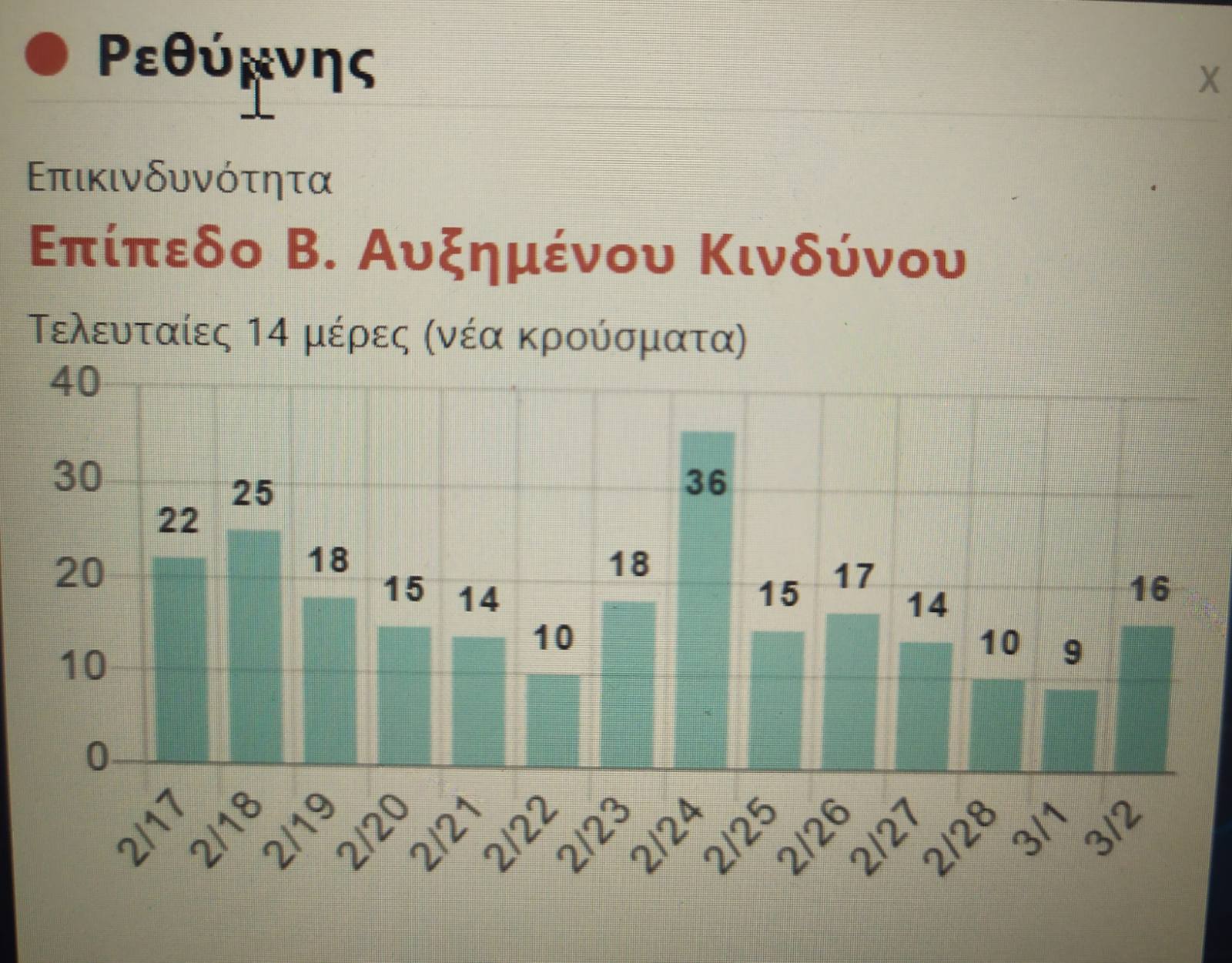 Η Περιφερειακή Ενότητα Ρεθύμνου έχει 239 ενεργά κρούσματα με την κατάσταση τις τελευταίες μέρες να αποκλιμακώνεται ελαφρά, όμως παρουσιάζει ακόμα αύξηση σε σχέση με το προηγούμενο δεκαπενθήμερο κατά 21%. Τα συνολικά δε κρούσματα από την αρχή της πανδημίας είναι 763 στο νομό Ρεθύμνου.