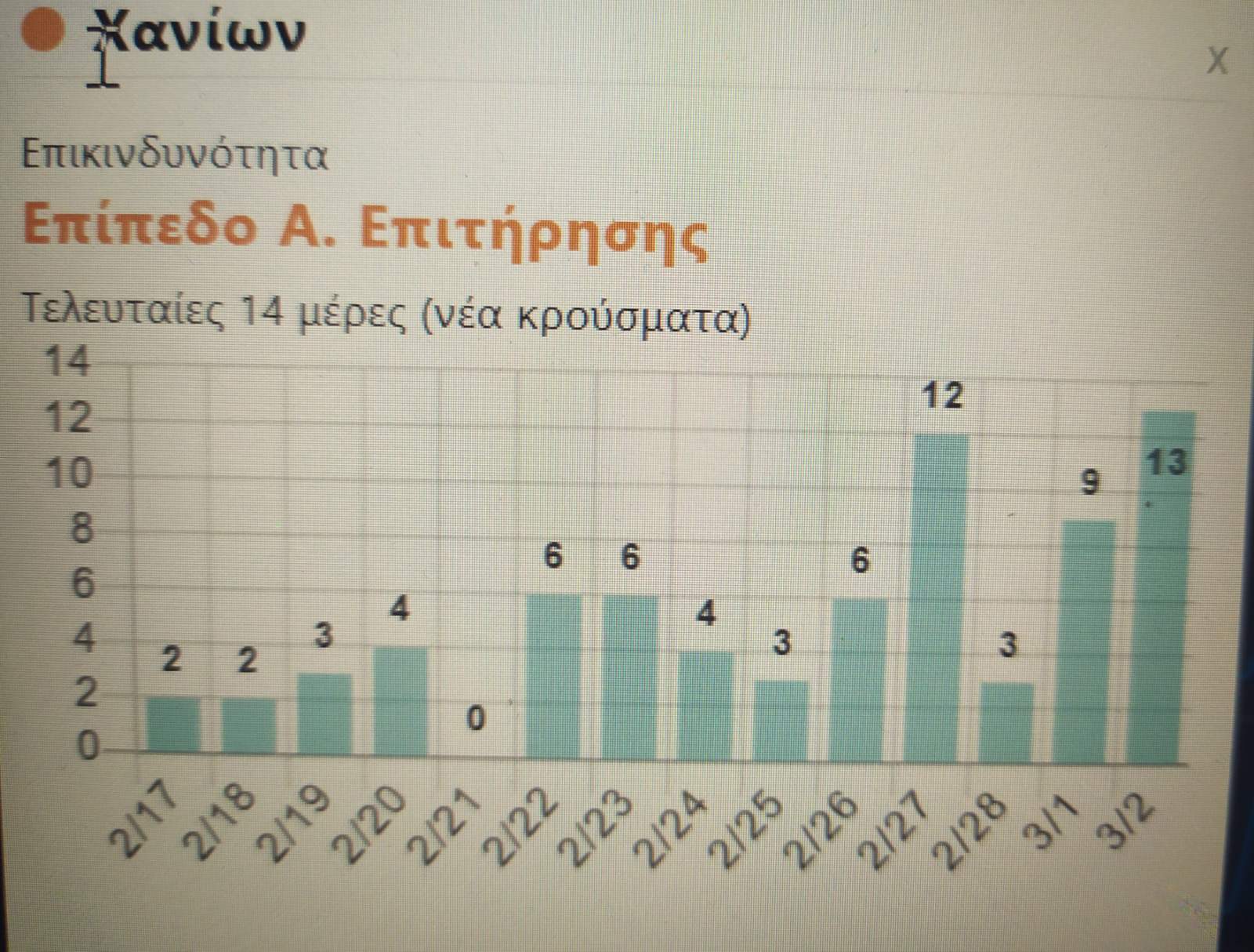 Μεγάλη αύξηση παρουσιάζουν τα ενεργά κρούσματα τις τελευταίες μέρες στην Περιφερειακή Ενότητα Χανίων καθώς ο συνολικός τους αριθμός είναι 73 με την αύξηση να είναι της τάξης του 75%. Είναι χαρακτηριστικό στην Περιφερειακή Ενότητα Χανίων πως μόνο τις τελευταίες 4 μέρες είχαμε 37 κρούσματα δηλαδή κάτι παραπάνω από τα μισά των 14 ημερών που θεωρούνται ενεργά κρούσματα. Συνολικά στο νομό Χανίων από την αρχή της πανδημίας έχουν βρεθεί 848 ασθενείς με κορωνοϊό.
