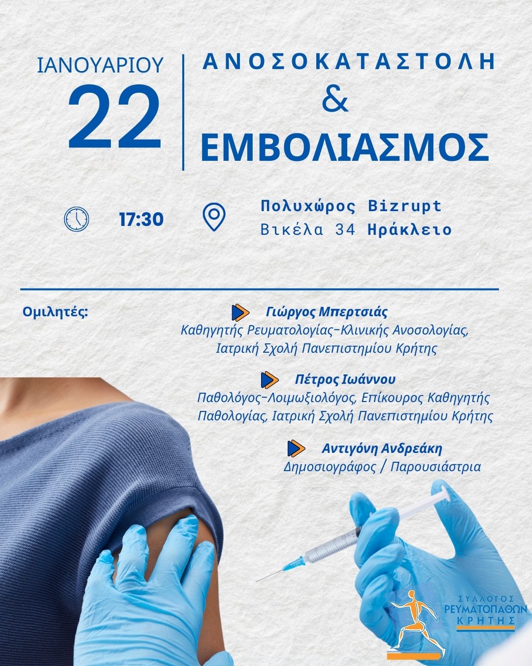 Ο Σύλλογος Ρευματοπαθών Κρήτης, μετά την αναβολή της εσπερίδας «Ανοκαταστολή & Eμβολιασμός» λόγω κακοκαιρίας, ανακοινώνει νέα ημερομηνία διεξαγωγής την Πέμπτη 22/01/2026 και ώρα 17:30 στον Πολυχώρο Bizrupt, Βικέλα 34 στο Ηράκλειο. Oμιλητές της εκδήλωσης θα είναι: