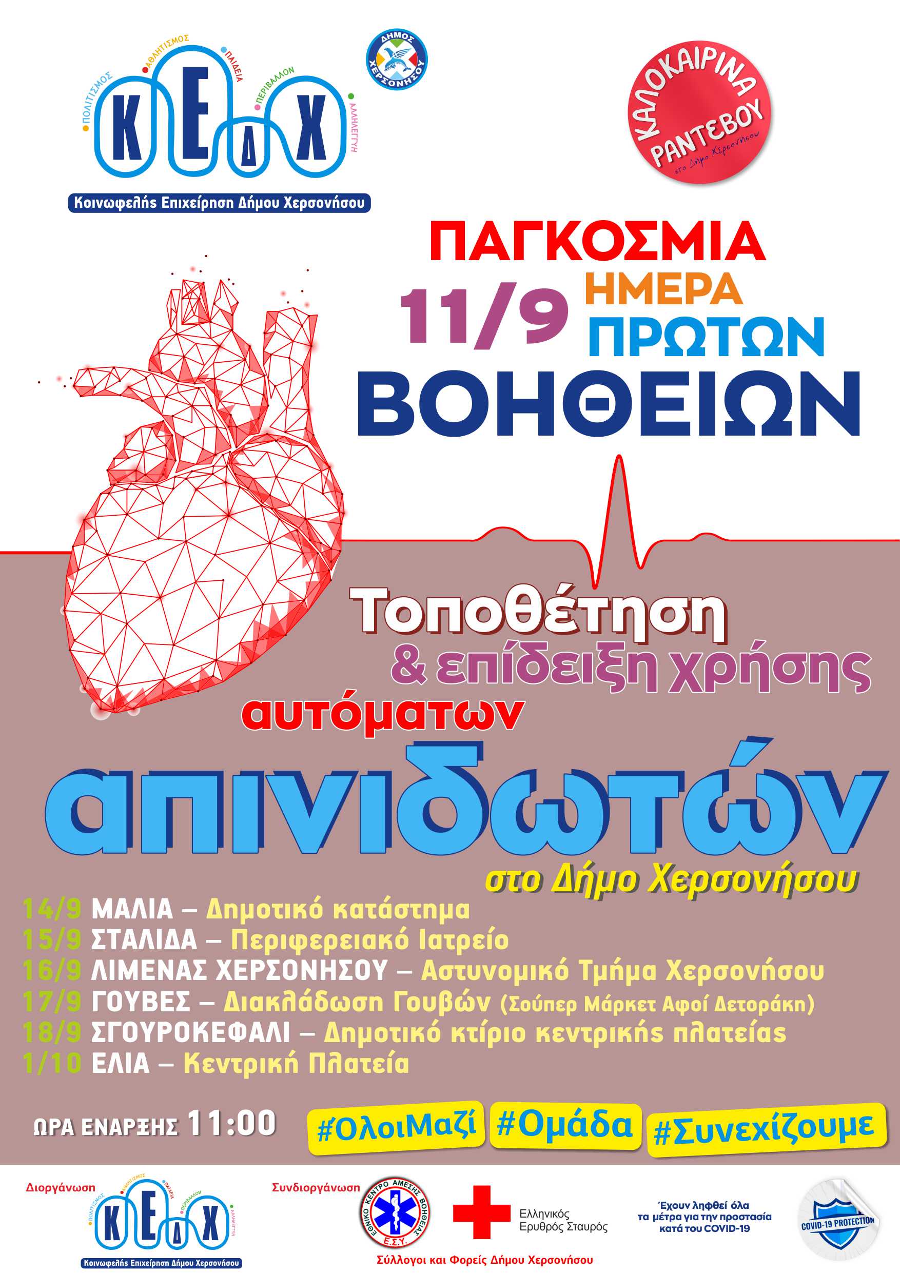 Παράλληλα, σε συνδιοργάνωση με το Σώμα Εθελοντών Σαμαρειτών, Διασωστών και Ναυαγοσωστών Ηρακλείου, το Εθνικό Κέντρο Άμεσης Βοήθειας (ΕΚΑΒ) Ηρακλείου και με Συλλόγους και Φορείς του Δήμου Χερσονήσου θα πραγματοποιηθεί ενημέρωση – επίδειξη χρήσης του αυτόματου εξωτερικού απινιδωτή.