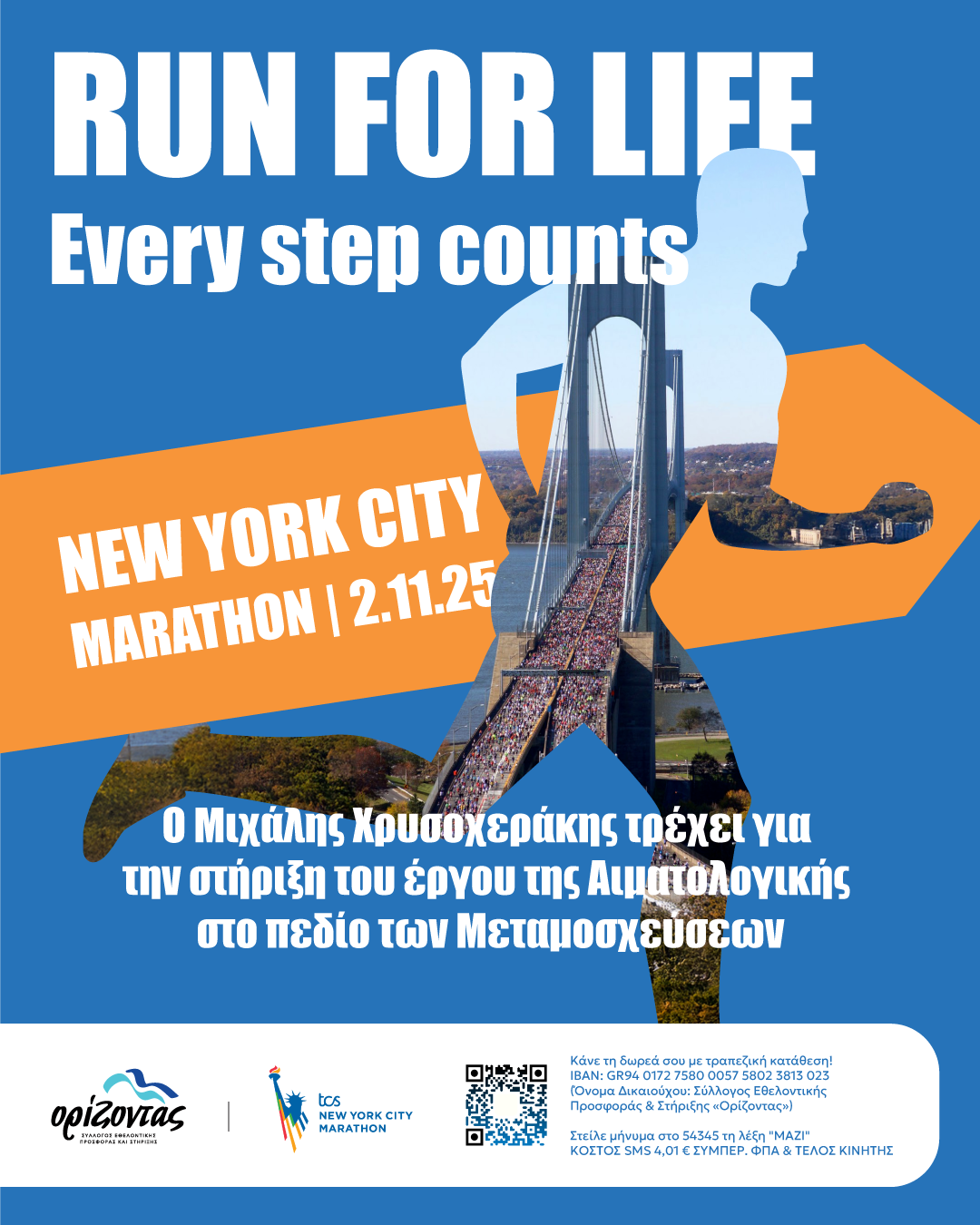 Με πλούσια εθελοντική και αθλητική πορεία — 35 Μαραθώνιοι σε όλο τον κόσμο, πάνω από 60 Ημιμαραθώνιοι και δεκάδες αγώνες δρόμου με τα χρώματα του «Ορίζοντα» και το σύνθημα «ΑΓΩΝΑΣ ΓΙΑ ΖΩΗ» — ο Μιχάλης θα τρέξει στις 2 Νοεμβρίου 2025 στον Μαραθώνιο της Νέας Υόρκης, καλύπτοντας ο ίδιος όλα τα έξοδά του και αφιερώνοντας τη συμμετοχή του στη συγκέντρωση χρημάτων για τον παραπάνω σκοπό.
