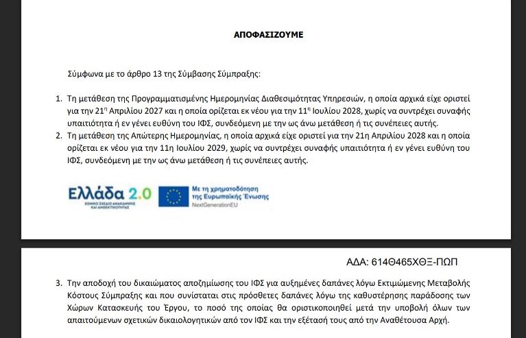 Σύμφωνα λοιπόν με την απόφαση, το Υπουργείο Υποδομών αποδέχεται το δικαίωμα αποζημίωσης του αναδόχου για “αυξημένες δαπάνες λόγω Εκτιμώμενης Μεταβολής Κόστους Σύμπραξης και που συνίσταται στις πρόσθετες δαπάνες λόγω της καθυστέρησης παράδοσης των Χώρων Κατασκευής του Έργου, το ποσό της οποίας θα οριστικοποιηθεί μετά την υποβολή όλων των απαιτούμενων σχετικών δικαιολογητικών από τον ΙΦΣ και την εξέτασή τους από την Αναθέτουσα Αρχή”.