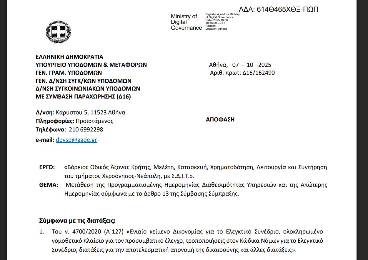 Το Creta24.gr αποκαλύπτει την απόφαση του αρμόδιου υπουργού Χρίστου Δήμα, σύμφωνα με την οποία η ολοκλήρωση του έργου παίρνει παράταση για τον Ιούλιο του 2029 και αποδέχεται το δικαίωμα αποζημίωσης του αναδόχου που εκτελεί το έργο.