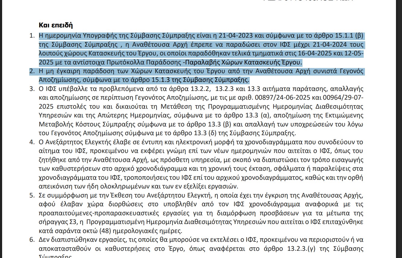 Σύμφωνα με το άρθρο 15.1.1 της Σύμβασης Σύμπραξης , η Αναθέτουσα Αρχή, δηλαδή το Υπουργείο Υποδομών, έπρεπε να παραδώσει στον Ιδιωτικό Φορέα Σύμπραξης, δηλαδή την ανάδοχο εταιρία, τους χώρους κατασκευής του έργου μέχρι τον Απρίλιο του 2024 οι οποίοι παραδόθηκαν τελικά τμηματικά στις 16 Απριλίου του 2025 και στις 12 Μαίου του ίδιου έτους.