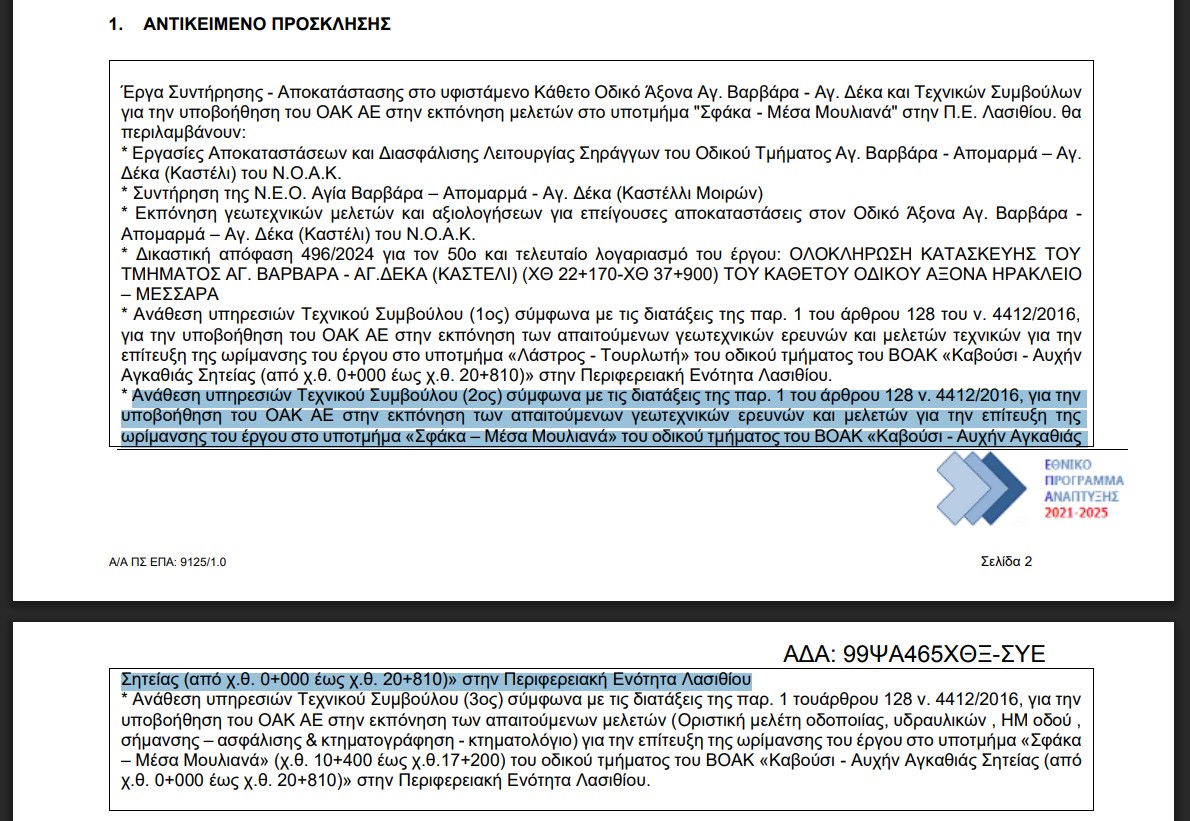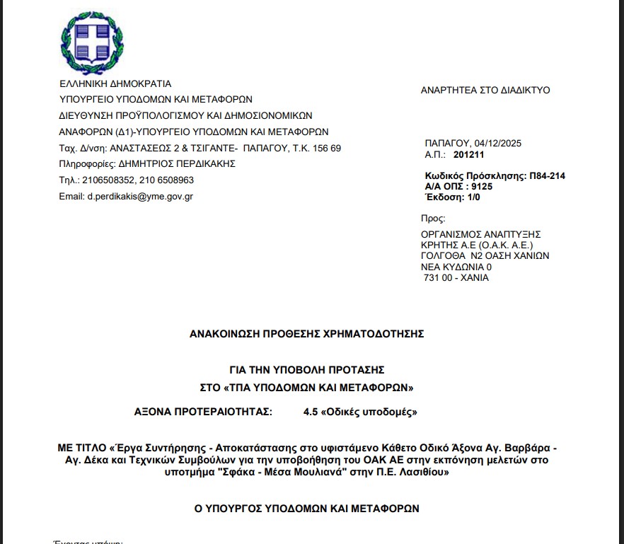 Όπως αποκαλύπτει το creta24.gr, το υπουργείο Υποδομών αναθέτει την εκπόνηση των απαιτούμενων γεωτεχνικών ερευνών και τεχνικών μελετών στον Οργανισμό Ανάπτυξης Κρήτης ανακοινώνοντας παράλληλα τη σχετική χρηματοδότηση για τους τεχνικούς συμβούλους ολοκλήρωσης της οριστικής μελέτης οδοποιίας και των αντίστοιχων γεωτεχνικών μελετών στο συγκεκριμένο τμήμα.