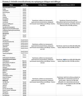Επιπλέον, η ΓΓΑ προχώρησε στην περαιτέρω εξειδίκευση των όρων και των προϋποθέσεων όσων ισχύουν για την άθληση σε όλη τη χώρα, με την έκδοση αναλυτικών «Διευκρινιστικών Οδηγιών» (δημοσιεύονται όπως πάντα στην ιστοσελίδα της και στο ειδικό τμήμα «Αθλητισμός και Covid-19») και την παράθεση των εξής δύο πινάκων: