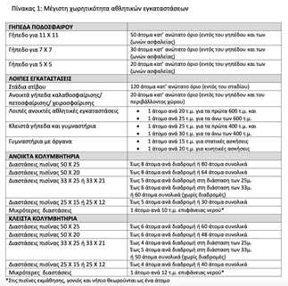 * Μέγιστες χωρητικότητες ανοιχτών και κλειστών εγκαταστάσεων για προπόνηση και άθληση.
