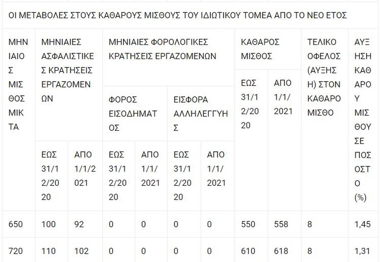 – Εντέλει, οι εργαζόμενοι στον ιδιωτικό τομέα με μικτές μηνιαίες αποδοχές από 650 έως 6.500 ευρώ, οι οποίες αντιστοιχούν σήμερα σε καθαρές μηνιαίες αποδοχές από 550 έως 3.354,67 ευρώ (μετά την αφαίρεση των μηνιαίων κρατήσεων ασφαλιστικών εισφορών, φόρου εισοδήματος και ειδικής εισφοράς αλληλεγγύης), θα λάβουν επί των καθαρών μηνιαίων αποδοχών τους αυξήσεις που θα κυμαίνονται σε ποσοστά από 1,45% έως και 10,43% και σε ποσά από 8 έως και 349,83 ευρώ. Ετσι, από τον Ιανουάριο του 2021, οι καθαρές μηνιαίες αποδοχές τους θα κυμαίνονται πλέον από 558 έως 3.794,49 ευρώ!