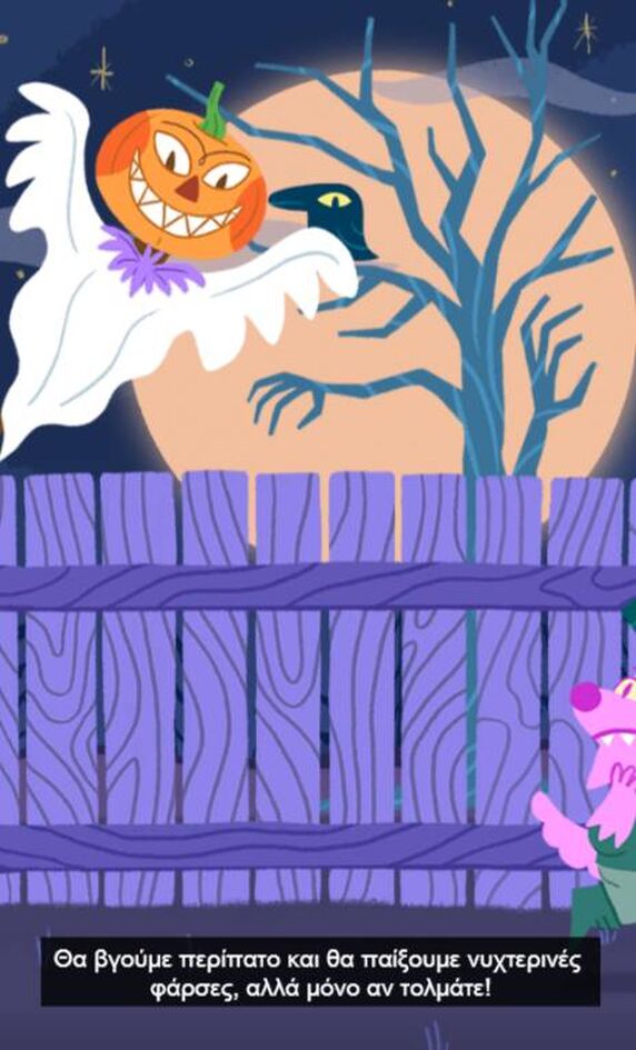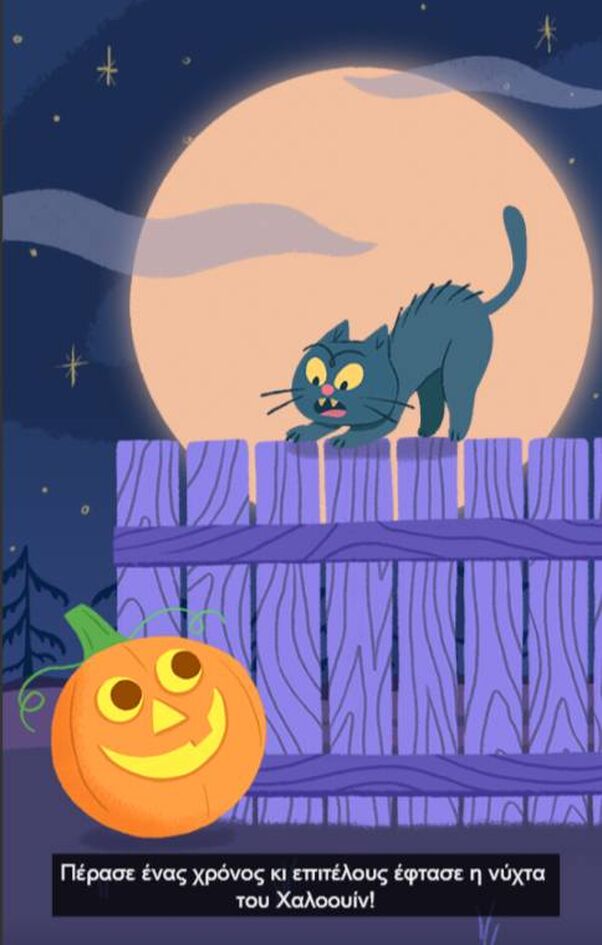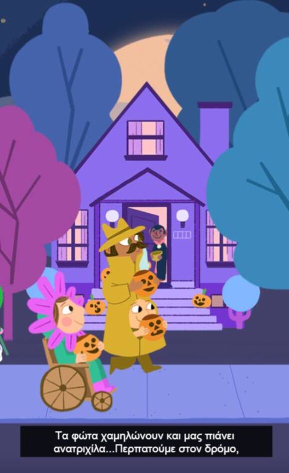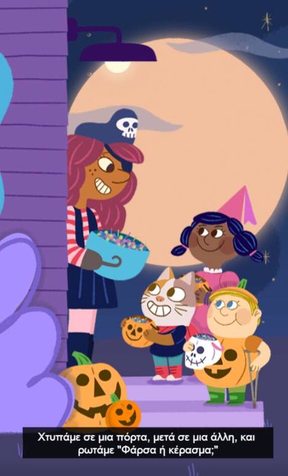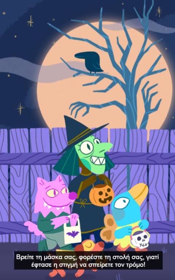 «Βρείτε τη μάσκα, φορέστε της στολή σας γιατί ήρθε η στιγμή… να σκορπίσετε τον τρόμο» γράφει το βίντεο του Doodle, με το βράδυ της 31ης Οκτωβρίου, τα μικρά παιδιά να μεταμφιέζονται σε κάτι τρομακτικό και να επισκέπτονται σπίτια μαζεύοντας πολλά γλυκά.