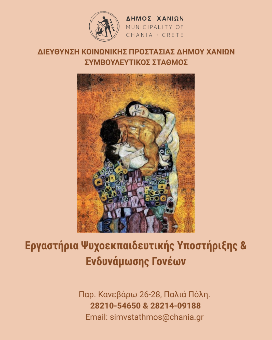 Ο Συμβουλευτικός Σταθμός της Διεύθυνσης Κοινωνικής Προστασίας του Δήμου Χανίων, σε συνεργασία με τη Δημοτική Βιβλιοθήκη, ανακοινώνει την έναρξη νέου κύκλου ενημερωτικών συναντήσεων για γονείς με τίτλο: «Εργαστήρια Ψυχοεκπαιδευτικής Υποστήριξης και Ενδυνάμωσης Γονέων», για την περίοδο Νοέμβριος 2025 – Μάιος 2026.