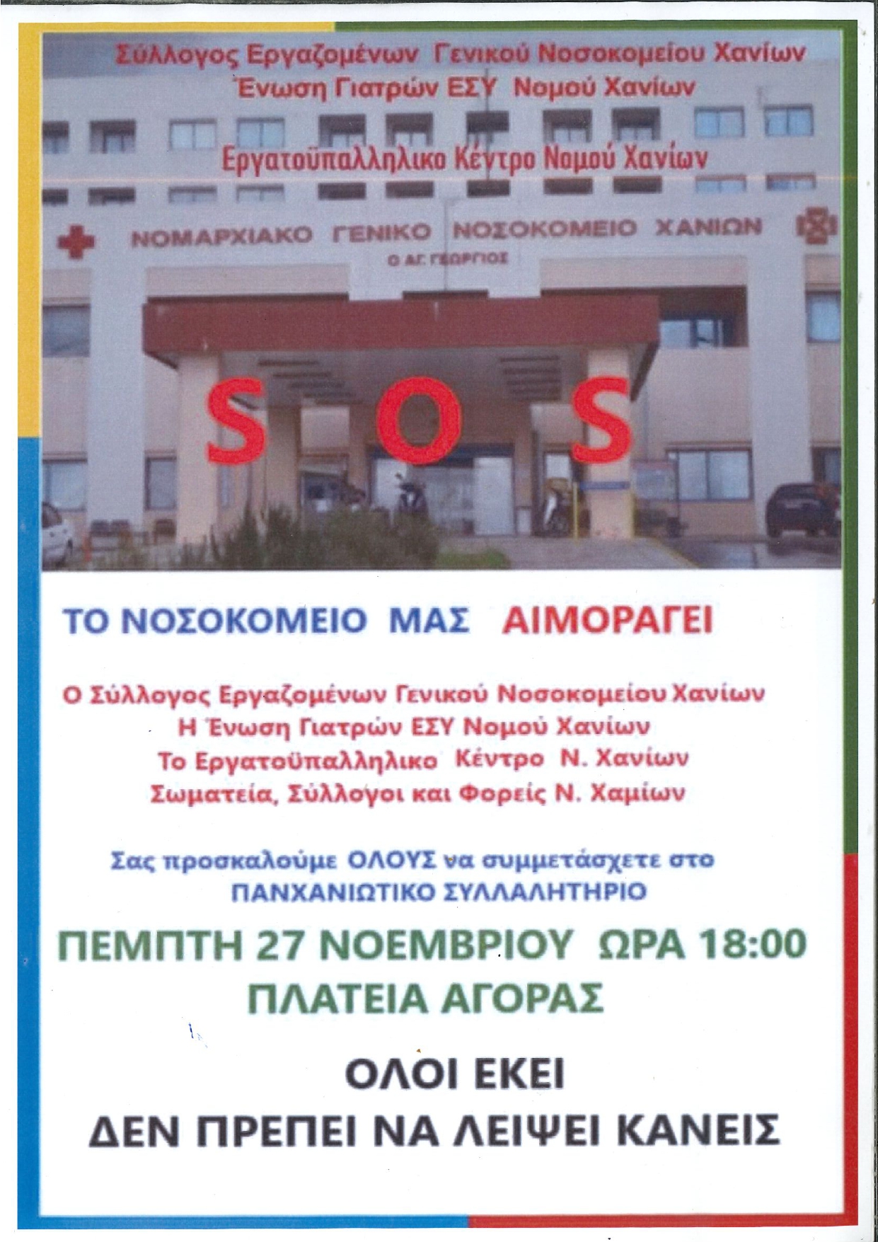 Ο Σύλλογος Εργαζομένων Νοσοκομείου Χανίων, η Ένωση Γιατρών ΕΣΥ Ν. Χανίων και το Εργατ/κό Κέντρο Ν. Χανίων, συναποφασίσαμε την συνδιοργάνωση Παγχανιώτικου Συλλαλητηρίου στις 27 Νοεμβρίου, ημέρα Πέμπτη και ώρα 6.00’ μ.μ. στην Πλατεία Αγοράς για να διατρανώσουμε και να διεκδικήσουμε τη στελέχωση των δομών υγείας και την δημόσια-δωρεάν υγεία.