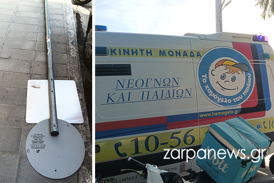 Μια γυναίκα τραυματίστηκε στο κεφάλι το μεσημέρι στα Χανιά, όταν πινακίδα σήμανσης κόπηκε και έπεσε την ώρα που εκείνη περπατούσε στο πεζοδρόμιο επί της οδού Κυδωνίας.