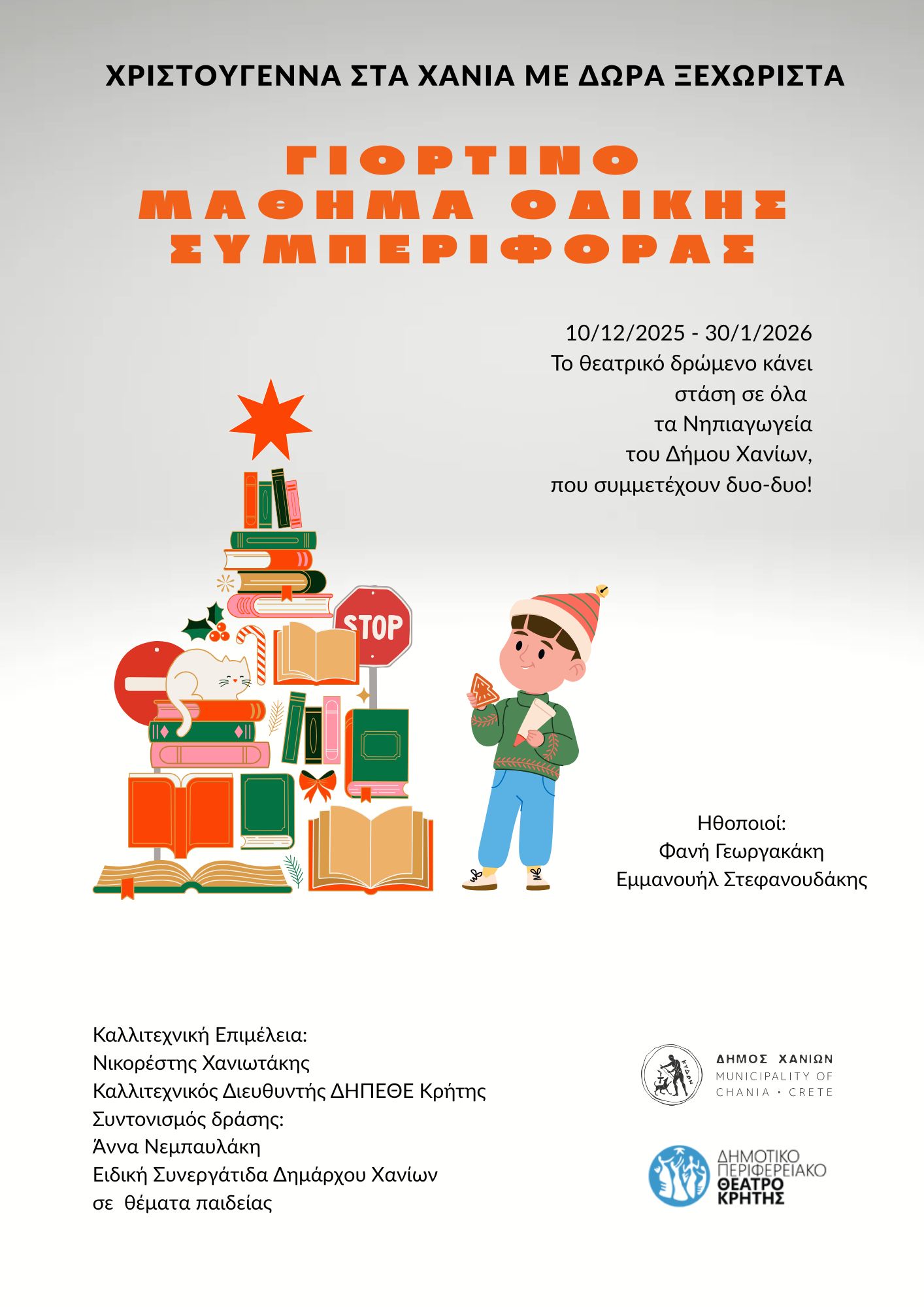 Τέλος, σχετικά με τις παραστάσεις, που θα πραγματοποιηθούν στα Νηπιαγωγεία του Δήμου Χανίων η Φανή Γεωργακάκη ανέφερε: «Υπό την επιμέλεια του καλλιτεχνικού μας διευθυντή, Νικορέστη Χανιωτάκη θα κάνουμε στάση στα Νηπιαγωγεία των Χανίων, τα οποία θα συμμετέχουν δυο-δυο, θα γνωριστούν, θα κάνουν παρέα και μαζί θα προχωρήσουμε για τα μαθήματα οδικής συμπεριφοράς, μέσω του θεάτρου».