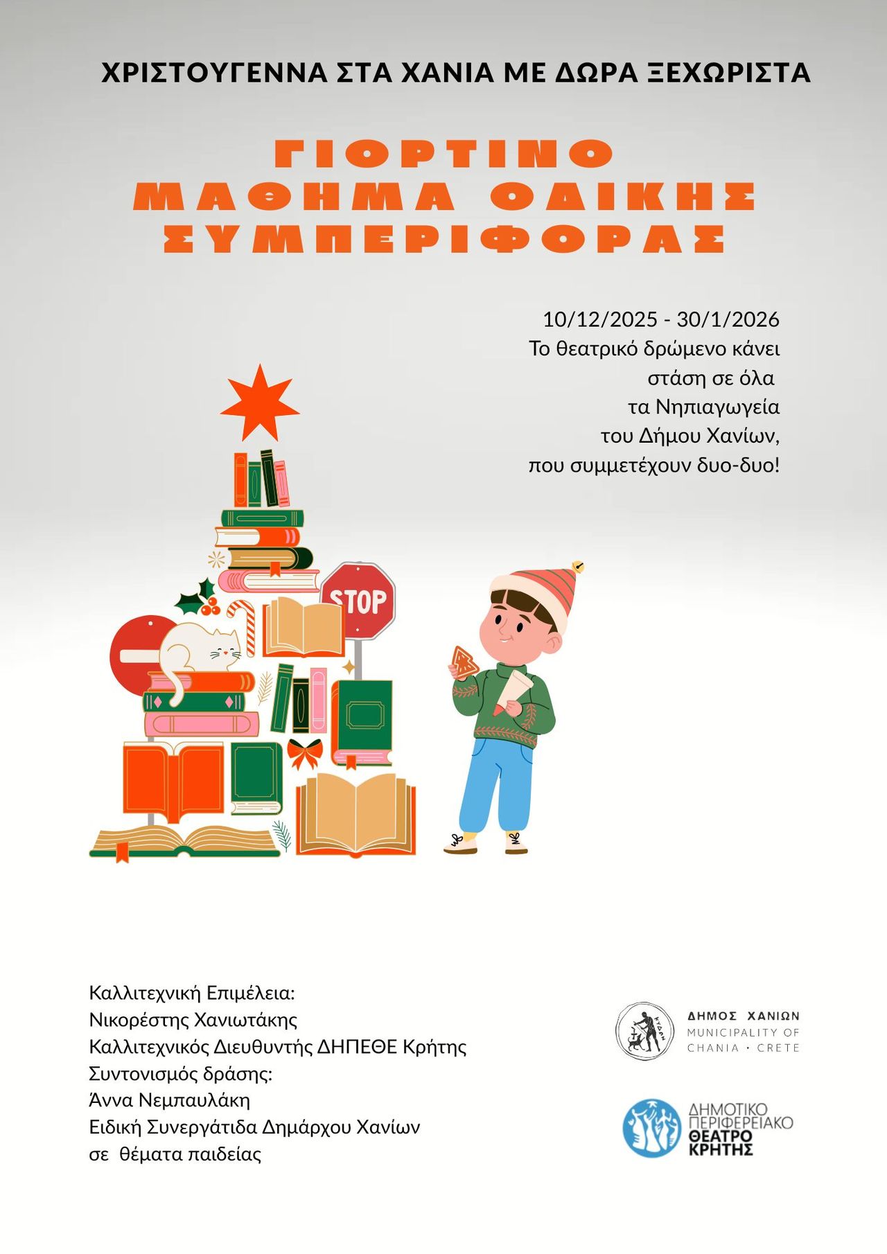 Ο Δήμος Χανίων και το ΔΗΠΕΘΕ Κρήτης προσφέρουν, ως γιορτινό δώρο, σε όλα τα Νηπιαγωγεία του Δήμου ένα ιδιαίτερο θεατρικό δρώμενο, που χαρίζει στα παιδιά ένα χαρούμενο, χριστουγεννιάτικο και ταυτόχρονα εκπαιδευτικό «μάθημα οδικής συμπεριφοράς».