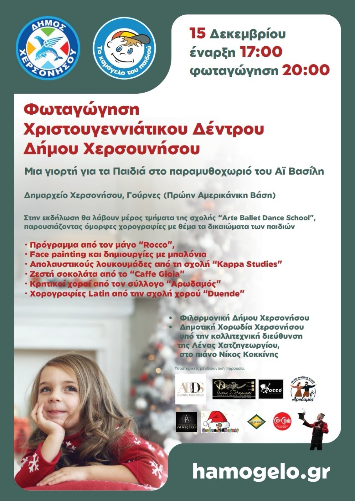 Ο Δήμος Χερσονήσου, σε συνεργασία με «Το Χαμόγελο του Παιδιού», σας προσκαλεί να ζήσετε τη μαγεία των Χριστουγέννων στο Παραμυθοχωριό του Αϊ Βασίλη, την Δευτέρα 15 Δεκεμβρίου στο Δημαρχείο Χερσονήσου στις Γούρνες (Πρώην Αμερικάνικη Βάση).