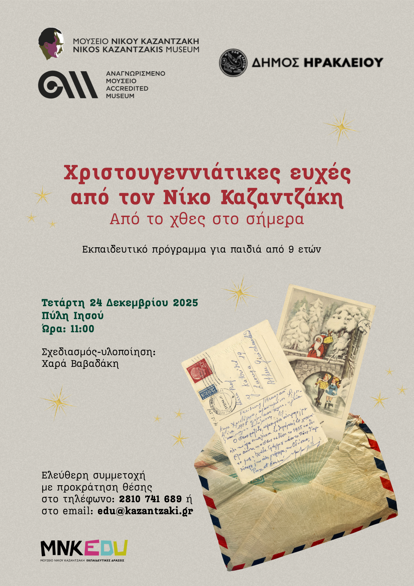 Το Τμήμα Εκπαιδευτικών Δράσεων του Μουσείου Νίκου Καζαντζάκη στο πλαίσιο των εορταστικών δράσεων που διοργανώνει ο Δήμος Ηρακλείου «Χριστούγεννα στην Πόλη 2025», σας προσκαλεί την Τετάρτη 24 Δεκεμβρίου και ώρα 11:00 στην Πύλη Ιησού, στο εορταστικό εκπαιδευτικό πρόγραμμα με τίτλο «Χριστουγεννιάτικες ευχές από τον Νίκο Καζαντζάκη: από το χθες στο σήμερα» για παιδιά ηλικίας από 9 ετών και άνω.