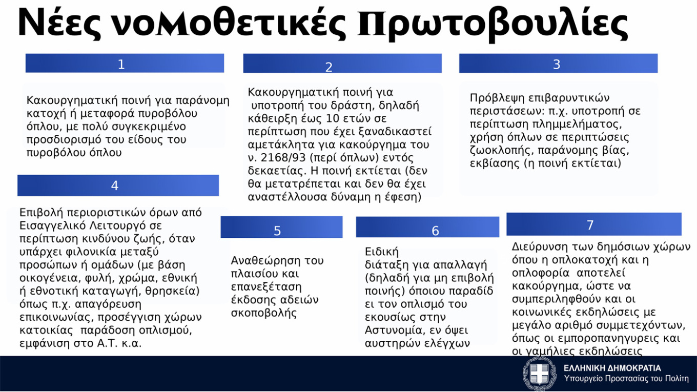 - Κακουργηματική ποινή για παράνομη κατοχή η μεταφορά όπλου για πυροβόλα όπλα με συγκεκριμένη αναφορά για όπλα. Προστίθενται τα πιστόλια και τα περίστροφα.