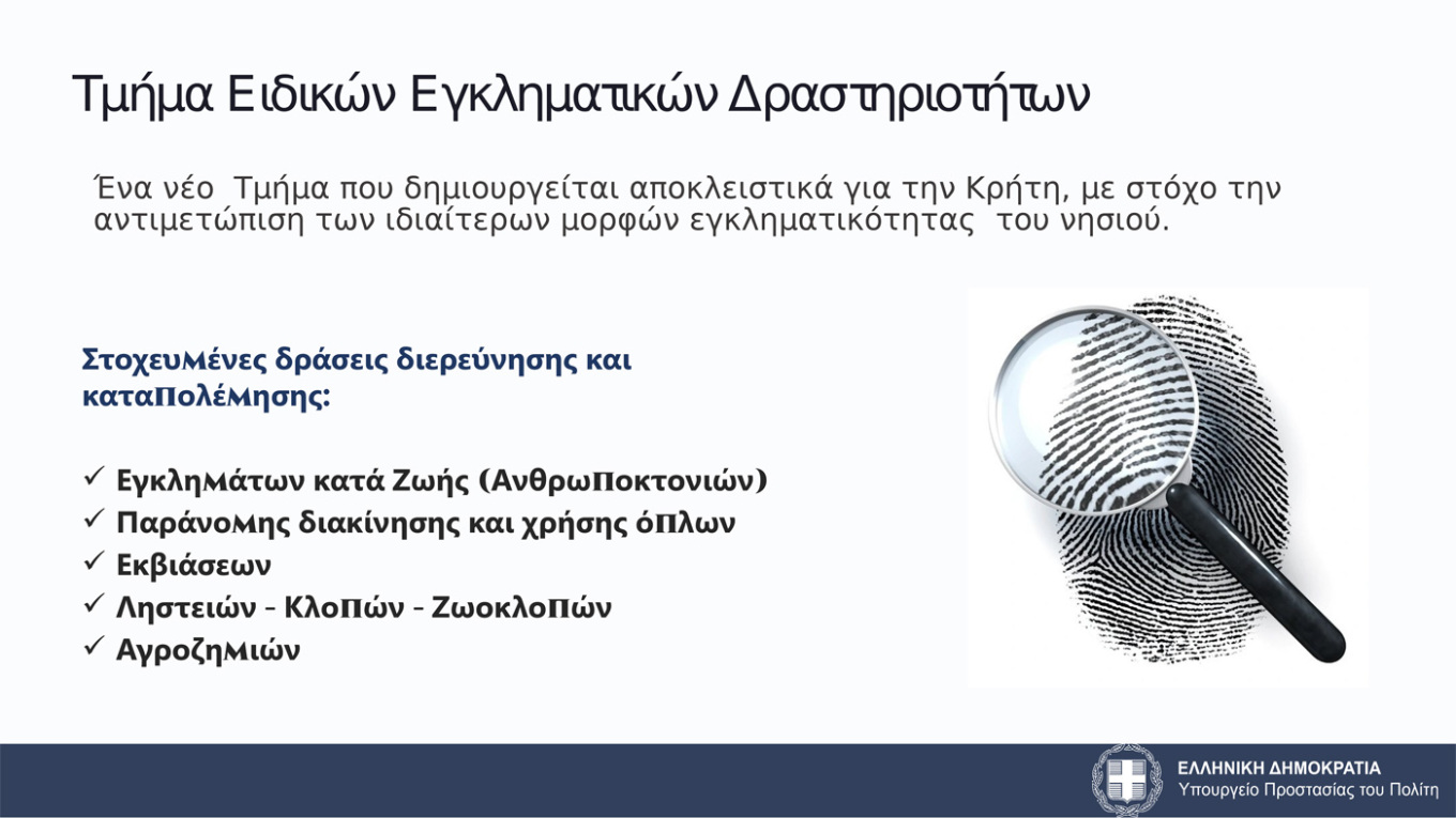 - Ίδρυση ειδικού Τμήματος Εγκληματικών Δραστηριοτήτων. Δημιουργείται νέα μονάδα στο πλαίσιο της Υποδιεύθυνσης Κρήτης του «ελληνικού FBI», με αποστολή την εξάρθρωση εγκληματικών δικτύων και τη διαχείριση σύνθετων υποθέσεων οργανωμένης εγκληματικότητας.
