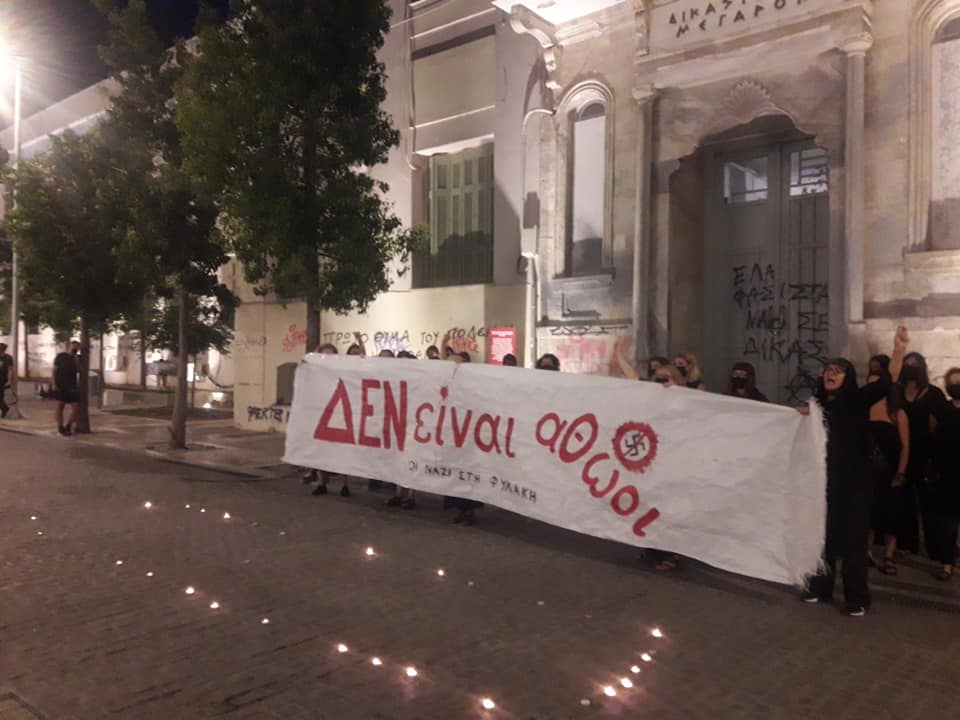 «Αντιφασίστριες της πόλης του Ηρακλείου συναντηθήκαμε το απόβραδο της Παρασκευής 2 Οκτώβρη 2020 για μια εκδήλωση που στηρίζει την καμπάνια ΔΕΝ ΕΙΝΑΙ ΑΘΩΟΙ ενόψει της απόφασης της δίκης της ναζιστικής οργάνωσης Χρυσή Αυγή, μια δίκη που διήρκεσε 5,5 χρόνια και αφορούσε τη σύσταση εγκληματικής οργάνωσης, επιθέσεις και δολοφονίες, όπως η δολοφονία του Παύλου Φύσσα, οι επιθέσεις στους Αιγύπτιους αλιεργάτες και στους συνδικαλιστές του ΠΑΜΕ κ.ά.