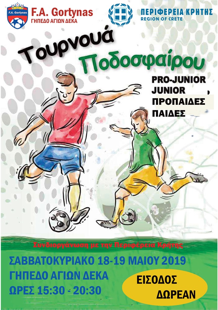 Το Σαββατοκύριακο 18-19 Μαΐου θα γίνει το 2ο Πασχαλινό Παιδικό Τουρνουά Ποδοσφαίρου (Summer 2019)στο γήπεδο των Αγίων Δέκα με τη συμμετοχή των Ακαδημιών Αθλόπολις, Γόρτυνας, Κόρακα, Ζαρού, Ραύκου, Φαιστού, με τις ομάδες των Ηλικιών 2005/2006, 2007/2008, 2009/2010 και 2011/2012. Το τουρνουά συνδιοργανώνουν η F.A. Gortynas με την Περιφέρεια Κρήτης.