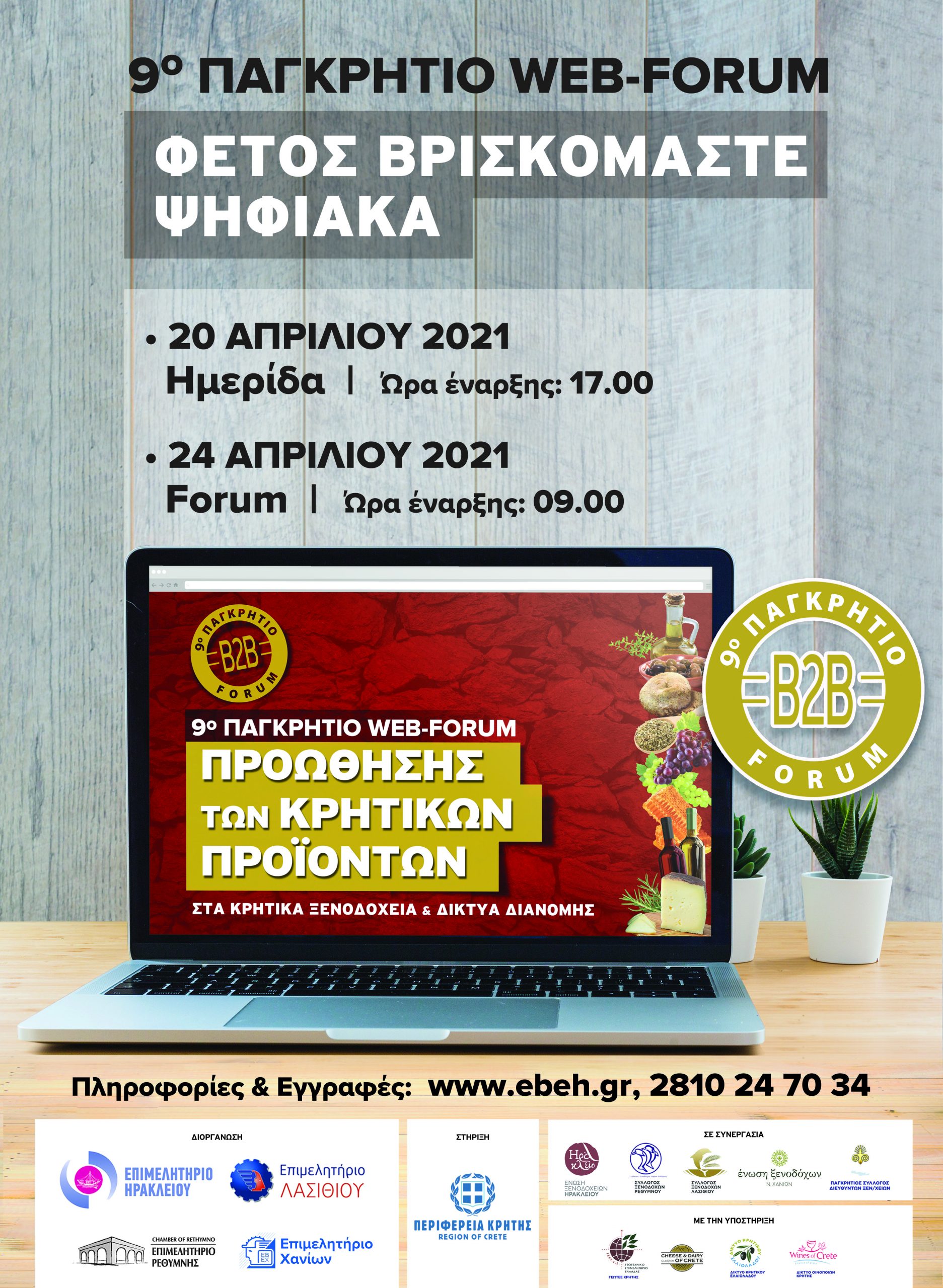 Προσαρμοσμένο στις νέες συνθήκες, λόγω COVID-19, θα είναι φέτος το 9ο ΠΑΓΚΡΗΤΙΟ ΦΟΡΟΥΜ ΠΡΟΩΘΗΣΗΣ ΚΡΗΤΙΚΩΝ ΠΡΟΪΟΝΤΩΝ ΣΤΑ ΚΡΗΤΙΚΑ ΞΕΝΟΔΟΧΕΙΑ ΚΑΙ ΤΑ ΔΙΚΤΥΑ ΔΙΑΝΟΜΗΣ – SUPER MARKET, το οποίο θα διεξαχθεί διαδικτυακά το Σάββατο 24 Απριλίου 2021, με τη στήριξη των τοπικών παραγωγικών φορέων όλης της Κρήτης.
