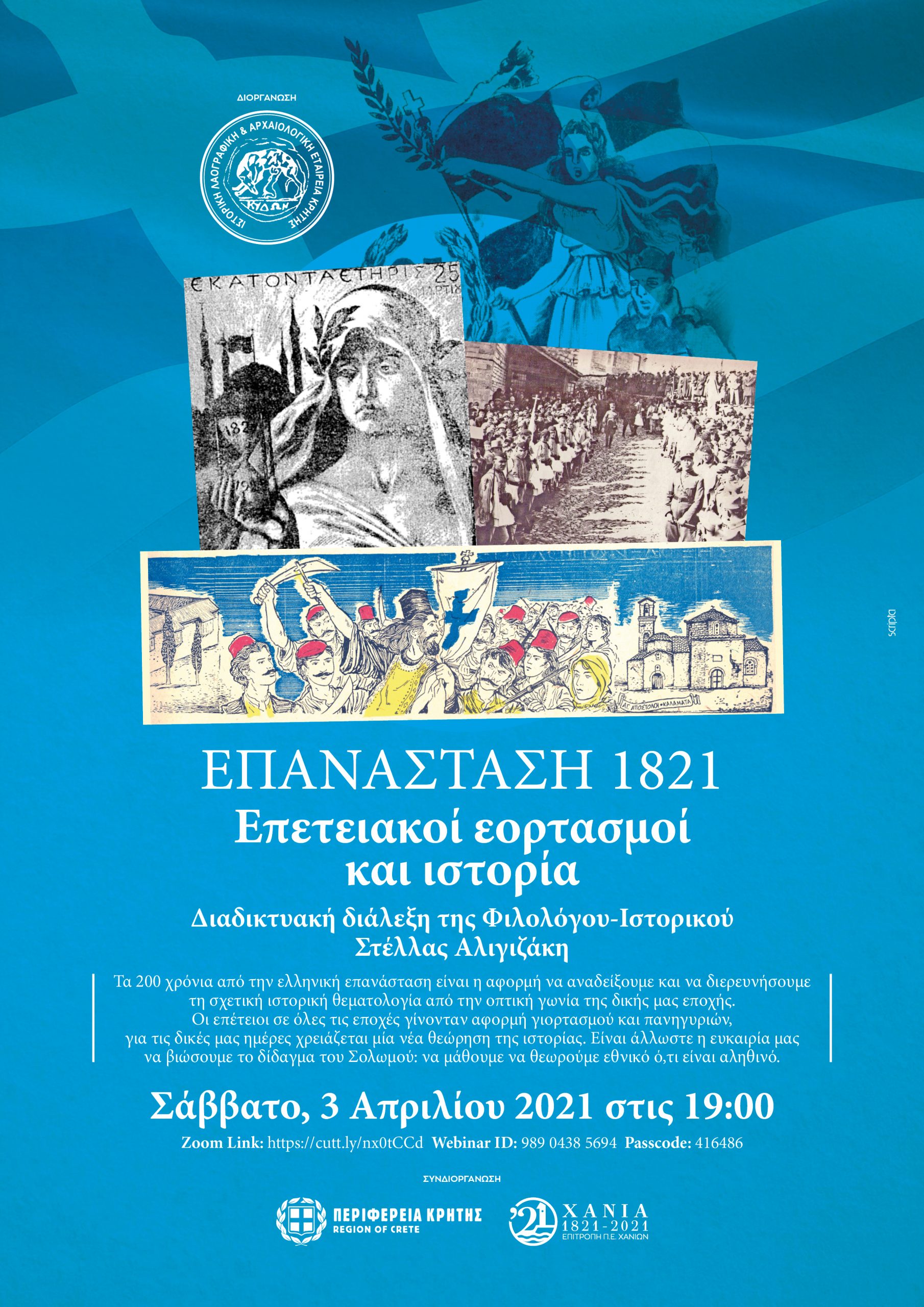 Η Περιφέρεια Κρήτης – Περιφερειακή Ενότητα Χανίων, η Ι.Λ.Α.Ε.Κ. και η Επιτροπή για τον «Εορτασμό των 200 Χρόνων από την Επανάσταση του 1821» Π.Ε. Χανίων συνδιοργανώνουν διαδικτυακή εκδήλωση με θέμα: “Επανάσταση του 1821 – επετειακοί γιορτασμοί και ιστορία”, το Σάββατο 3 Απριλίου 2021, ώρα 7 μ.μ.