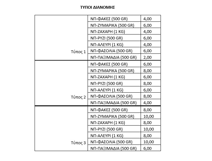 Η διανομή που θα πραγματοποιηθεί περιέχει προϊόντα παντοπωλείου (αλεύρι, ρύζι, ζάχαρη, φακές, ζυμαρικά, φασόλια, παξιμάδια). Παράλληλα θα δοθούν πλεονάζουσες ποσότητες σε δικαιούχους με βρέφη (γάλα, κρέμες βρεφικές) και σε δικαιούχους τύπου 2.