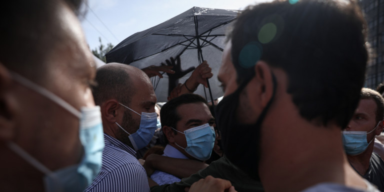 Τα στελέχη του ΣΥΡΙΖΑ έσπευσαν να προστατεύσουν τον πρόεδρο του κόμματος τους ανοίγοντας ομπρέλα προκειμένου να προστατευτεί από την ρίψη καφέδων και νερών.