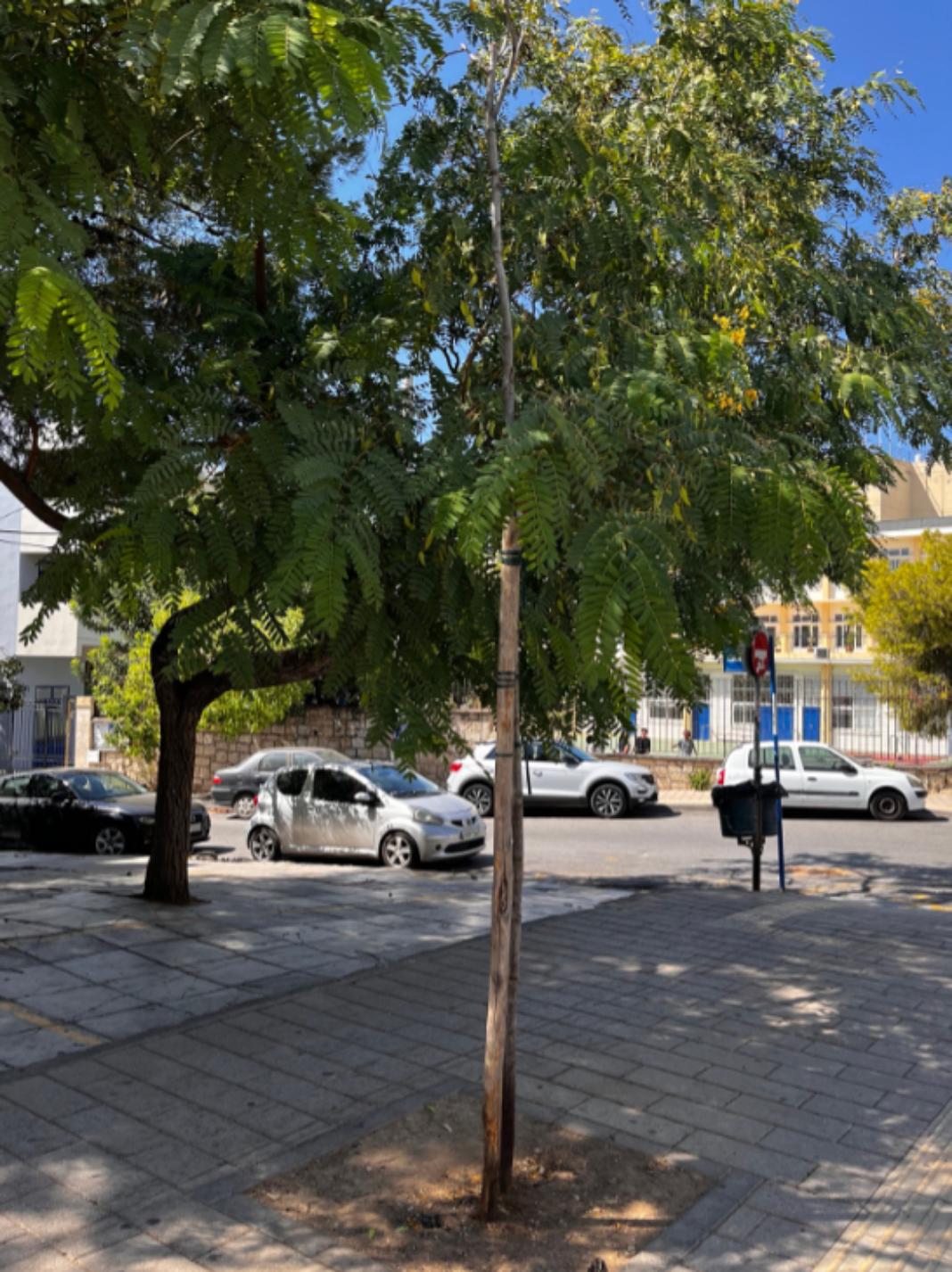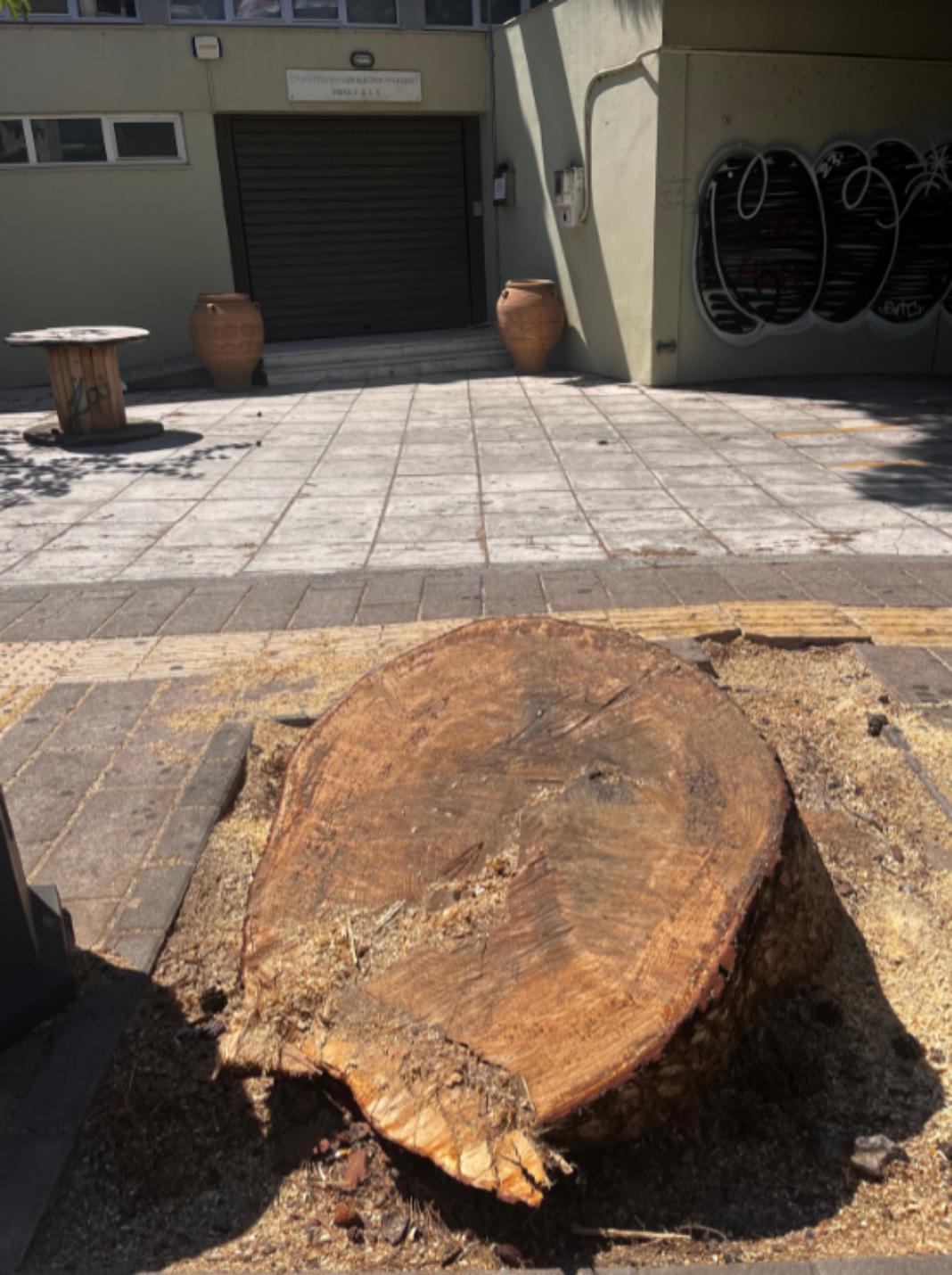 Επειδή είμασταν παρόντες κατά την υλοτόμησή του, ενσωματώνουμε στο παρόν ΔΤ πέντε από φωτογραφίες που λήφθησαν τόσο κατά την διάρκεια της κοπής όσο και από το πρεμνό του δέντρου που παρέμεινε στο έδαφος οι οποίες καταδεικνύουν ότι το δέντρο δεν είχε κανένα απολύτως πρόβλημα σε κανένα σημείο του. Οι φωτογραφίες, αλλά και δείγμα που ελήφθη από το σημείο θα σταλούν για πραγματογνωμοσύνη. Επισυνάπτουμε και μία φωτογραφία από την διπλανή δενδροδόχο του κομμένου πεύκου, μπροστά επίσης από το Εργατικό Κέντρο προκειμένου να γίνει κατανοητό στους πολίτες, που δεν μπορούν να πιστέψουν ότι ο Δήμος παρανομεί τόσο αναίσχυντα, τι εννοούν όταν λένε ότι θα φυτέψουν «νέο δέντρο»: Ένα κλαράκι διαμέτρου δυο πόντων το οποίο είναι ήδη ξερό.