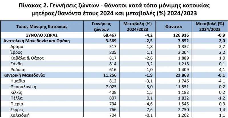 Αναλυτικότερα, όπως προκύπτει από το πρόσφατο ενημερωτικό σημείωμα της ΕΛΣΤΑΤ, και το 2024 οι θάνατοι υπερέβησαν τις γεννήσεις. Συγκεκριμένα, συνολικά 126.916 άτομα έφυγαν από τη ζωή, ενώ ο αριθμός των γεννήσεων το περσινό έτος ανήλθε σε 68.467. Συνεπώς, ο πληθυσμός της Ελλάδας μειώθηκε κατά 58.449 άτομα, όσο δηλαδή μια ολόκληρη πόλη!