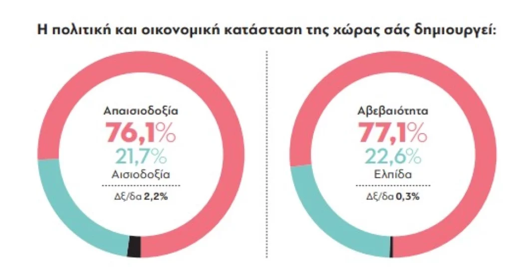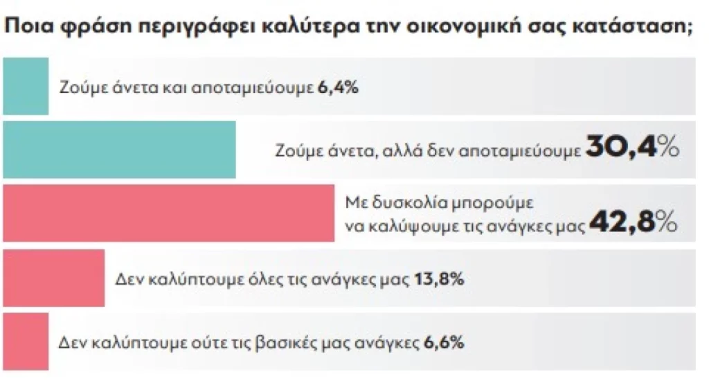 Κατά τα λοιπά, το κλίμα απαισιοδοξίας και αβεβαιότητας παραμένει κυρίαρχο για περισσότερους από 3 στους 4 πολίτες, με το 42,8% να δηλώνει ότι καταφέρνει να καλύπτει τις ανάγκες του με δυσκολία, το 13,8% να μην μπορεί να καλύψει το σύνολο των αναγκών του και το 6,6% να εμφανίζεται αδύναμο να εξυπηρετήσει ακόμα και βασικές ανάγκες.