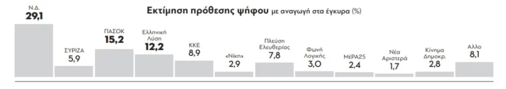 Όσον αφορά στην εκτίμηση ψήφου, η ΝΔ συγκεντρώνει ποσοστό 29,1%, το ΠΑΣΟΚ 15,2%, η Ελληνική Λύση 12,2%, το ΚΚΕ 8,9%, η Πλεύση Ελευθερίας 7,8%, ο ΣΥΡΙΖΑ 5,9% και η Φωνή Λογικής 3%.