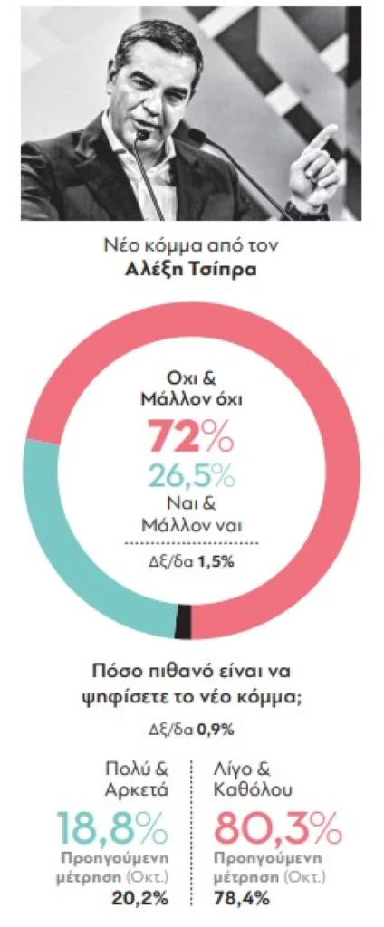 Όσον αφορά στα – πιθανά – νέα κόμματα, η δημοσκόπηση δείχνει ότι ως ωφέλιμη για τη χώρα και τους πολίτες κρίνεται από το 26,5% η ίδρυση ενός κόμματος από τον Αλέξη Τσίπρα και 17,4% από τον Αντώνη Σαμαρά, ενώ 26,1 % θεωρεί ωφέλιμη την ίδρυση κόμματος από την Μαριά Καρυστιανού. Πάντως, σημειώνεται ότι με την εκλογική επιρροή δεν πρέπει να ταυτίζεται η δυνητική ψήφος, που, επί της ουσίας, αποκαλύπτει τις δεξαμενές και τα όρια των υπό ίδρυση κομμάτων, με τον κ. Τσίπρα να καταγράφεται ως πολύ πιθανή επιλογή από το 8,3% και ως αρκετά πιθανή από το 10,5%, με τα αντίστοιχα ποσοστά για τον κ. Σαμαρά να διαμορφώνονται στο 2,2% συν 6,3%, ενώ η κ. Καρυστιανού καταγράφεται ως ισχυρή πιθανότητα για το 9,5% με τη δυνητική ψήφο να επεκτείνεται στο 10%, αθροίζοντας ένα συνολικό ποσοστό της τάξης του 19,5%.