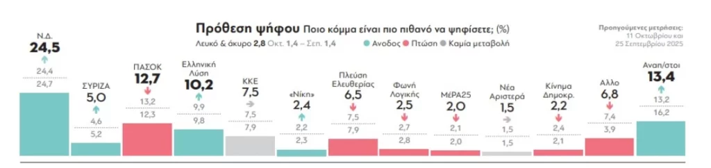 Συγκεκριμένα, στην πρόθεση ψήφου η ΝΔ συγκεντρώνει ποσοστό 24,5%, το ΠΑΣΟΚ 12,7% η Ελληνική Λύση εδραιωμένη πλέον στην τρίτη θέση 10,2%, το ΚΚΕ 7,5%, η Πλεύση Ελευθερίας 6,5%, 5% ο ΣΥΡΙΖΑ, ενώ η «γκρίζα ζώνη» (άλλο κόμμα/ΔΞ-ΔΑ) φθάνει το 20,2%.