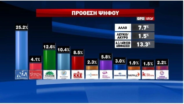 Άλλο κόμμα επιλέγει το 7,7% ενώ η δεξαμενή των αναποφάσιστων είναι 13,3%.