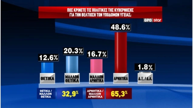 Το 65,3% κρίνει αρνητικά και μάλλον αρνητικά τις πολιτικές της κυβέρνησης για τη βελτίωση των υποδομών Υγείας.