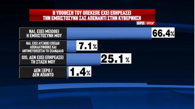 Λόγω της υπόθεσης του ΟΠΕΚΕΠΕ, το 66,4% δηλώνει ότι έχει μειωθεί η εμπιστοσύνη του στην κυβέρνηση.